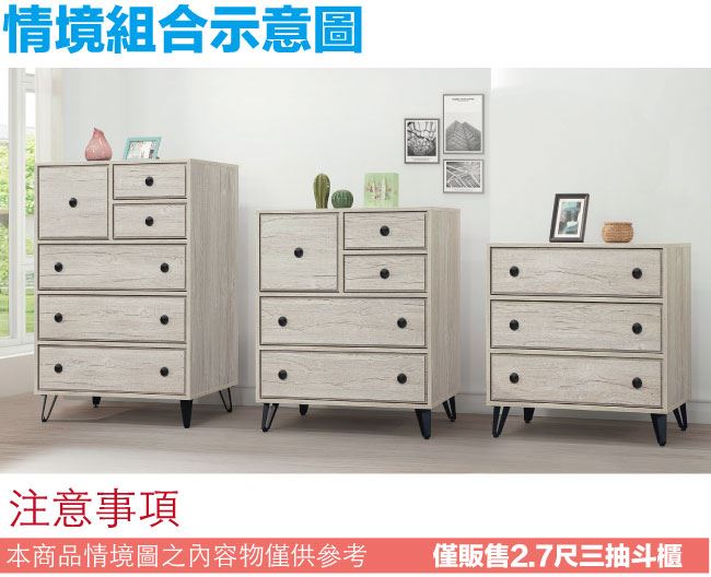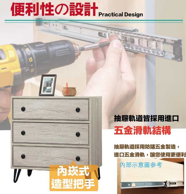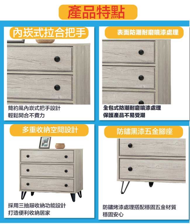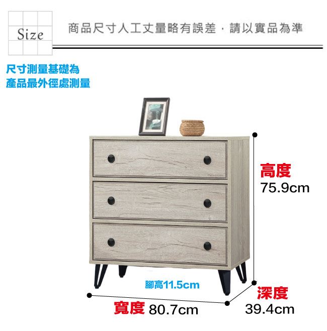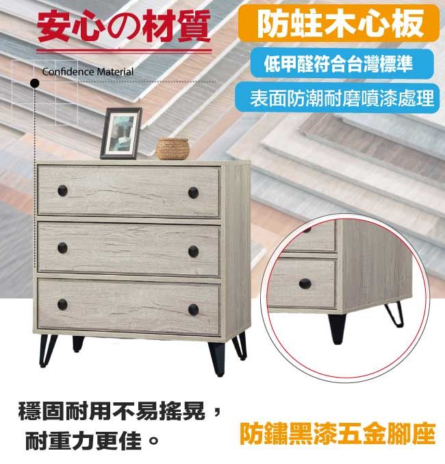 材質 | ◆產品名稱:【綠家居】邁可森2.7尺三抽斗櫃 尺寸:(寬)80.7x(深)39.4(高)75.9/公分 ◆材質: 材質:防蛀木心板+防鏽黑漆五金腳座+五金滑軌結構 噴漆:防潮耐磨噴漆處理