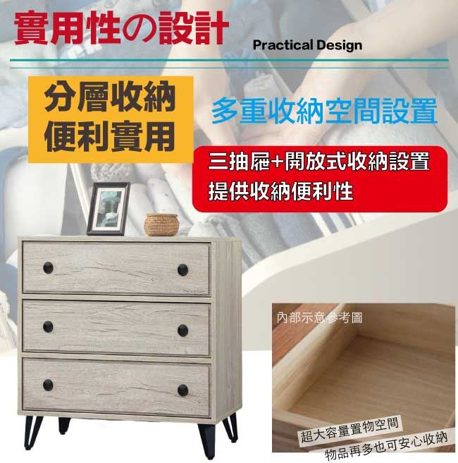商 品 介 紹 | 【綠家居】邁可森2.7尺三抽斗櫃 橡木紋色系+現代簡約風格+安心材質製造,使用放心+搭配居家更便利,整體採用防蛀木心板+五金滑軌結構+防鏽黑漆五金腳座等材質搭配外層採用優莉坦耐磨全包式噴漆處理 ,採用三抽屜+開放式空間等收納空間設計,全由專人配送到家,專業安心服務,替你省下更多時間! 【商品特色】 橡木紋色系+現代簡約風格+安心材質製造,使用放心+搭配居家更便利 防蛀木心板+防鏽黑漆五金腳座+五金滑軌結構等材質 採用三抽屜+開放式空間等收納空間設計 此商品不需要DIY組立,此商品為組立後之成品 品質保證、專業設計、貼心服務 全由專人配送到家,專業安心服務,替您省下更多時間 |
