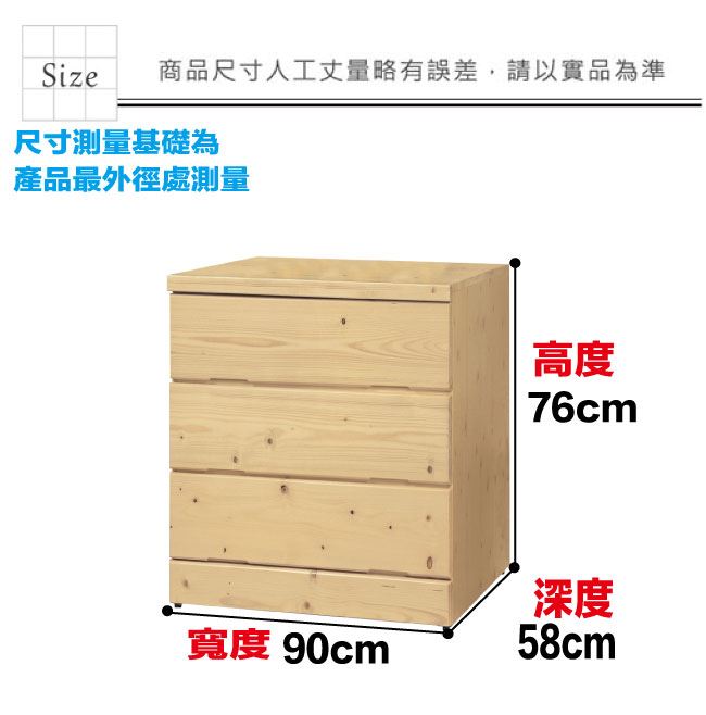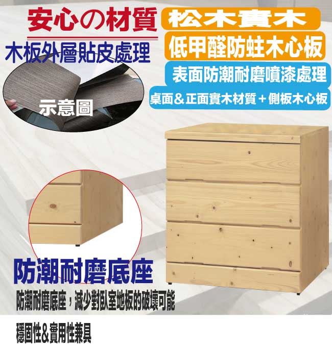 材質 | ◆產品名稱:【綠家居】范斯3尺實木三抽斗櫃 尺寸:(寬)90x(深)58x(高)76/公分 ◆材質: 材質:松木實木+防蛀木心板+防潮耐磨底座+五金滑軌結構 噴漆:防潮耐磨噴漆處理 |