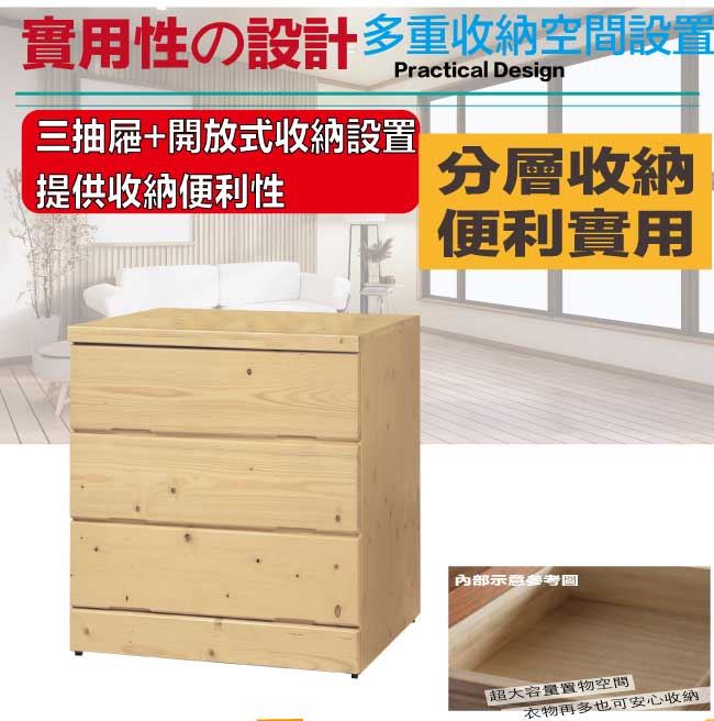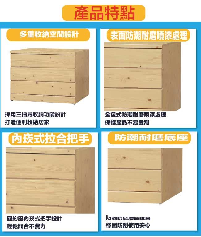 商 品 介 紹 | 【綠家居】范斯3尺實木三抽斗櫃 松木紋色系+現代簡約風格+安心材質製造,使用放心+搭配居家更便利,整體採用松木實木+防蛀木心板+防潮耐磨底座+五金滑軌結構等安心材質製造搭配外層採用優莉坦耐磨全包式噴漆處理 ,採用三抽屜+開放式桌面等收納空間設計,全由專人配送到家,專業安心服務,替你省下更多時間! 【商品特色】 松木紋色系+現代簡約風格+安心材質製造,使用放心+搭配居家更便利 松木實木+防蛀木心板+防潮耐磨底座+五金滑軌結構等安心材質製造 採用三抽屜+開放式桌面等收納空間設計 此商品不需要DIY組立,此商品為組立後之成品 品質保證、專業設計、貼心服務 全由專人配送到家,專業安心服務,替您省下更多時間