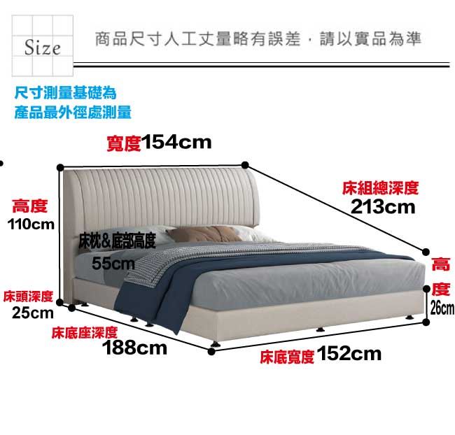 材質 | ◆產品名稱:【綠家居】坦思利5尺雙人貓抓布紋皮革床台組合(床頭片+床底+不含床墊) 床頭片尺寸:(寬)154x(深)25(高)110/公分 床底尺寸:(寬)152x(深)188(高)26/公分 床台組合尺寸:(寬)154x(深)213(高)110/公分 ◆材質: 材質:內置實木框架+防潮曲線腳座+防潮包覆底座+耐磨貓抓布紋皮革+高回彈泡棉+止滑天鵝絨布 |