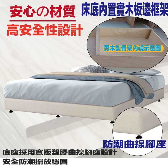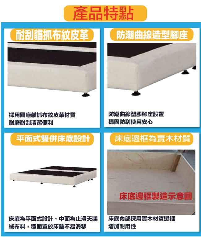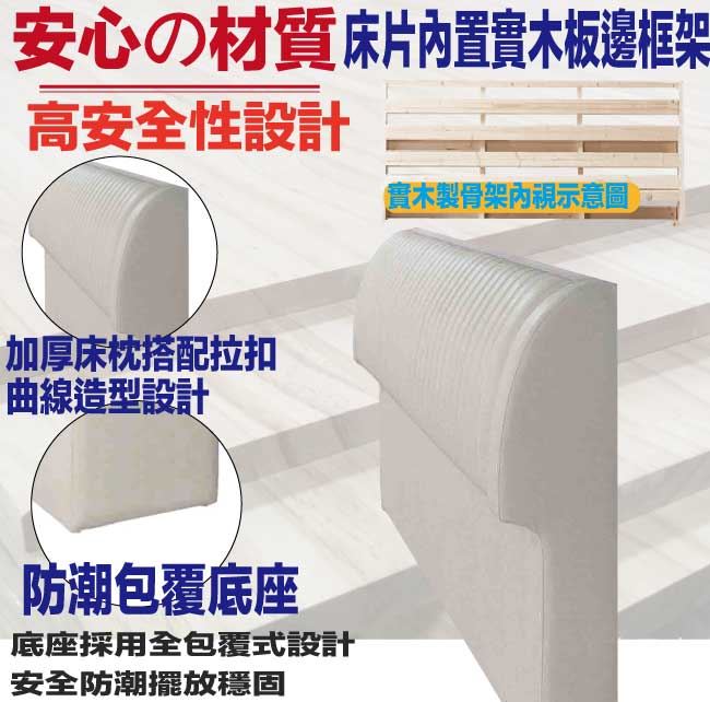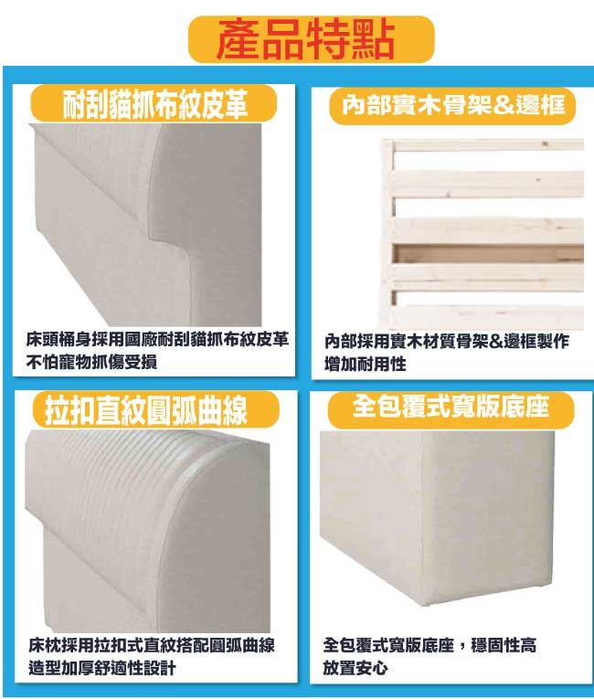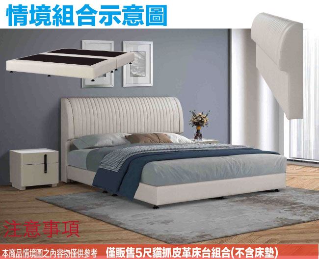 商 品 介 紹 | 【綠家居】坦思利5尺雙人貓抓布紋皮革床台組合(床頭片+床底+不含床墊) 北歐米色系+現代簡約風格+安心材質製造,整體採用內置實木框架+防潮曲線腳座+防潮包覆底座+耐磨貓抓布紋皮革+高回彈泡棉+止滑天鵝絨布等安心材質製造,搭配採用床底導圓邊框設計+平面式雙床底併合設計搭配止滑天鵝絨布面,可讓床墊平穩置放避免破壞結構,並減少床墊位移不穩的困擾,全由專人配送到家,專業安心服務,替你省下更多時間! 【商品特色】 北歐米色系+現代簡約風格+安心材質製造,使用放心+搭配居家更便利 採用內置實木框架+防潮曲線腳座+防潮包覆底座+耐磨貓抓布紋皮革+高回彈泡棉+止滑天鵝絨布等安心材質製造 搭配採用床底導圓邊框設計+平面式雙床底併合設計搭配止滑天鵝絨布面,可讓床墊平穩置放避免破壞結構,並減少床墊位移不穩的困擾 此商品不需要DIY組立,此商品為組立後之成品 品質保證、專業設計、貼心服務 全由專人配送到家,專業安心服務,替您省下更多時間