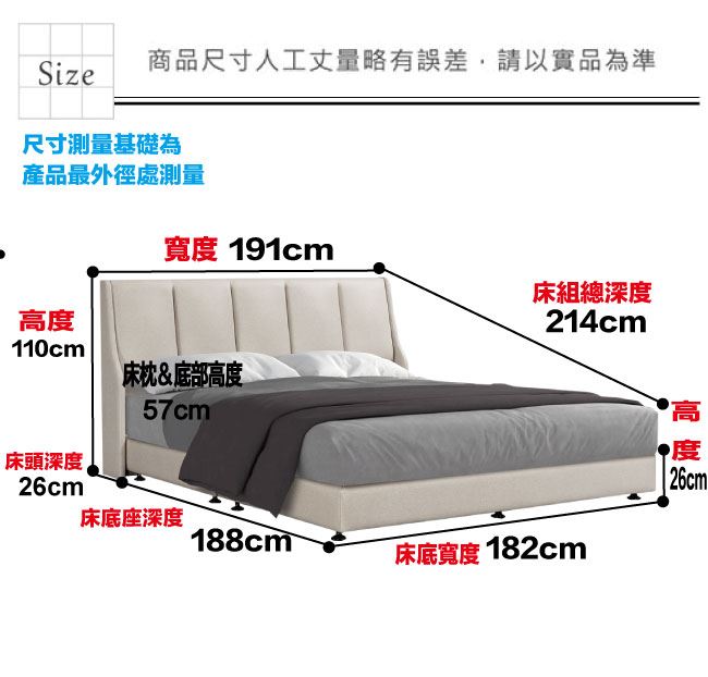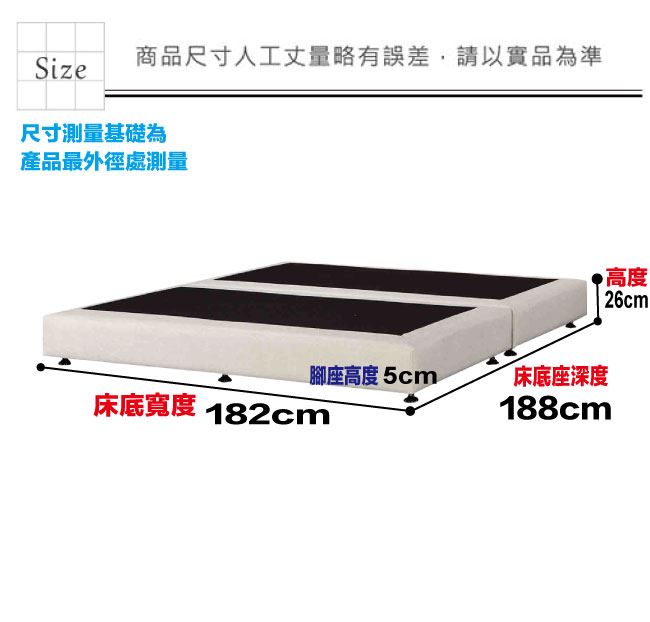 材質 | ◆產品名稱:【綠家居】菲坦6尺雙人加大貓抓布紋皮革床台組合(床頭片+床底+不含床墊) 床頭片尺寸:(寬)191x(深)26(高)110/公分 床底尺寸:(寬)182x(深)188(高)26/公分 床台組合尺寸:(寬)191x(深)214(高)110/公分 ◆材質: 材質:內置實木框架+防潮曲線腳座+防潮包覆底座+耐磨貓抓布紋皮革+高回彈泡棉+止滑天鵝絨布 |
