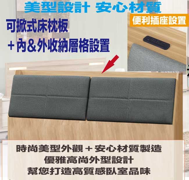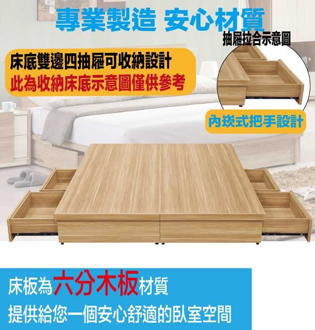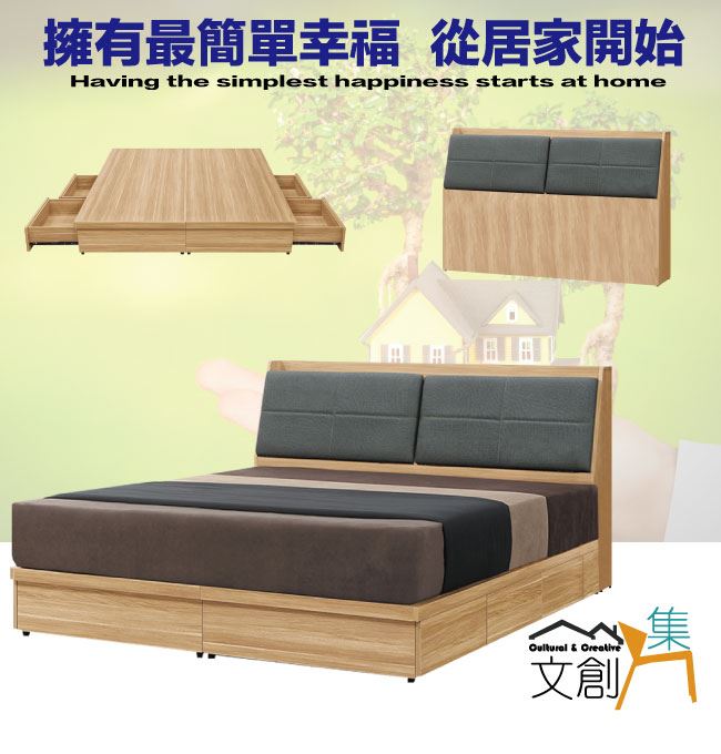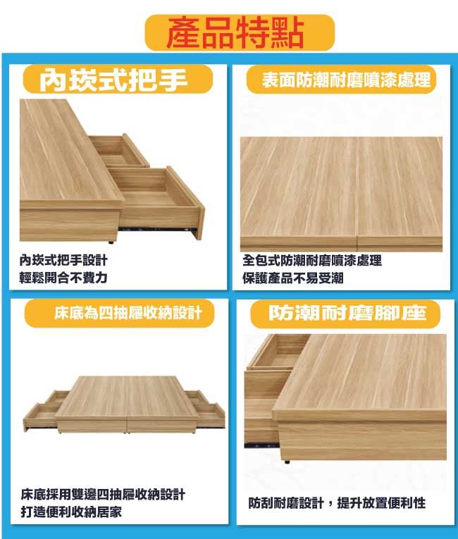 商 品 介 紹 | 【綠家居】約書亞5尺雙人貓抓皮革四抽床台組合(床頭箱+四抽床底+不含床墊) 橡木紋色系+現代簡約風格+安心材質製造,整體採用防蛀木心板+六分木床板+防潮耐磨腳座+耐刮貓抓皮革+高回彈泡棉等安心材質製造,產品外層採用防潮耐磨噴漆處理搭配採用床頭箱可掀式床枕板+內&外收納層格+便利插座設置+床底座雙邊開合四抽屜等收納空間設計,全由專人配送到家,專業安心服務,替你省下更多時間! 【商品特色】 橡木紋色系+現代簡約風格+安心材質製造,使用放心+搭配居家更便利 採用防蛀木心板+六分木床板+防潮耐磨腳座+耐刮貓抓皮革+高回彈泡棉等安心材質製造 產品外層採用防潮耐磨噴漆處理 搭配採用床頭箱可掀式床枕板+內&外收納層格+便利插座設置+床底座雙邊開合四抽屜等收納空間設計 此商品不需要DIY組立,此商品為組立後之成品 品質保證、專業設計、貼心服務 全由專人配送到家,專業安心服務,替您省下更多時間