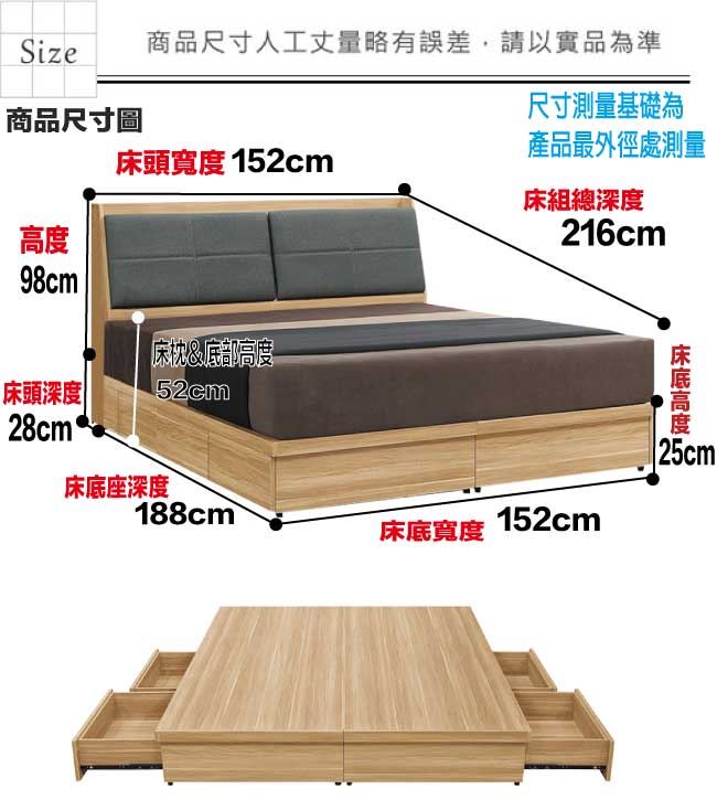 材質 | ◆產品名稱:【綠家居】約書亞5尺雙人貓抓皮革四抽床台組合(床頭箱+四抽床底+不含床墊) 床頭尺寸:(寬)152x(深)28x(高)98/公分 床底尺寸:(寬)152x(深)188(高)25/公分 床台組合尺寸:(寬)152x(深)216(高)98/公分 ◆材質: 材質:防蛀木心板+六分木床板+防潮耐磨腳座+耐刮貓抓皮革+高回彈泡棉 噴漆:防潮耐磨噴漆處理 |