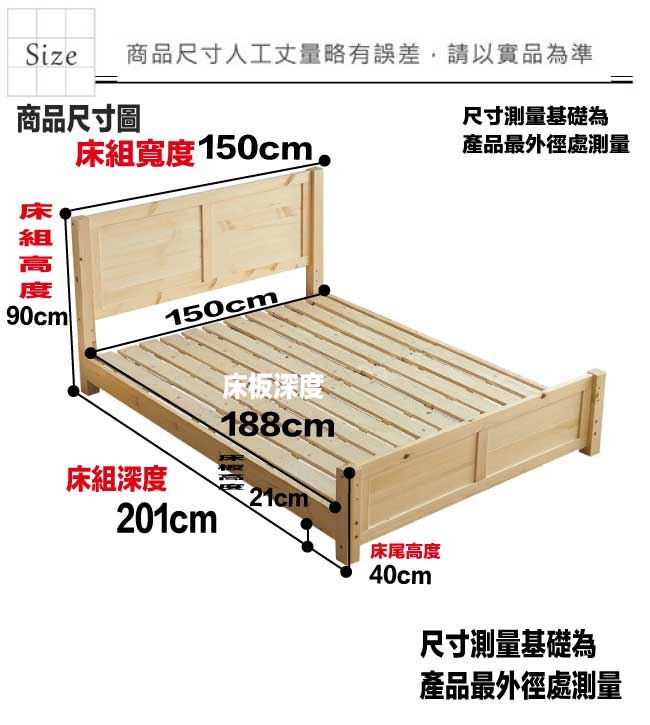 材質 | ◆產品名稱:【綠家居】富士利5尺實木雙人床台組合 床台組合尺寸:(寬)150x(深)201x(高)90/公分 ◆材質: 材質:松木實木+六分木床底板+防潮實木腳座 噴漆:防潮耐磨噴漆處理 |