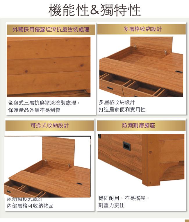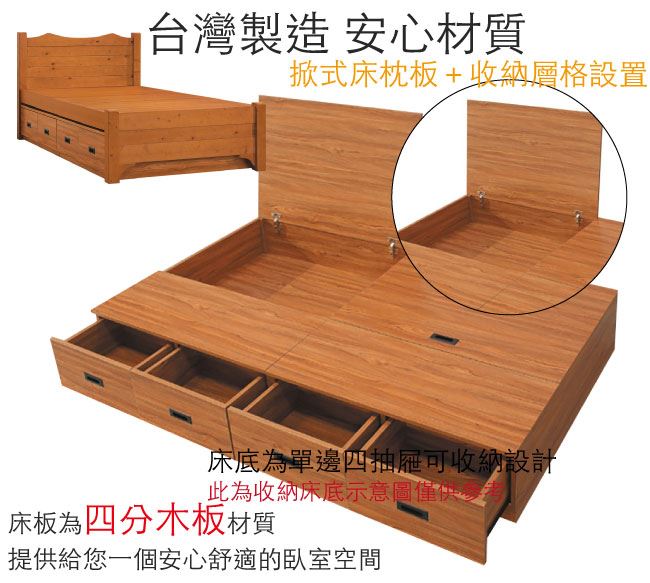 商品介紹 | 【綠家居】吉里巴斯 現代3.5尺木紋單人多功能收納床台組合(床頭片+四抽可掀式床底) 檜木紋色系+現代簡約風格+安心材質製造,整體採用防蛀木心板+四分木床板等安心材質製造,外層採用優利坦三層全包式耐磨塗漆塗裝處理搭配床底為四抽屜+可掀式床板+內部收納層格設置便利收納設計,全由專人配送到家,專業安心服務,替你省下更多時間! 【商品特色】 檜木紋色系+現代簡約風格+安心材質製造,使用放心+搭配居家更便利 採用防蛀木心板+四分木床板等安心材質製造 床底為四抽屜+可掀式床板+內部收納層格設置便利收納設計 此商品不需要DIY組立,此商品為組立後之成品 品質保證、專業設計、貼心服務 全由專人配送到家,專業安心服務,替您省下更多時間 |