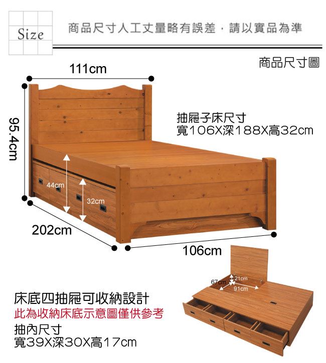材質 | ◆產品名稱:【綠家居】吉里巴斯 現代3.5尺木紋單人多功能收納床台組合(床頭片+四抽可掀式床底) 產品尺寸: 床台尺寸:(寬)111x(深)202x(高)95.4/公分 ◆材質: 材質:防蛀木心板+四分木床板 塗漆:優利坦三層全包式耐磨塗漆塗裝處理 |