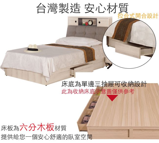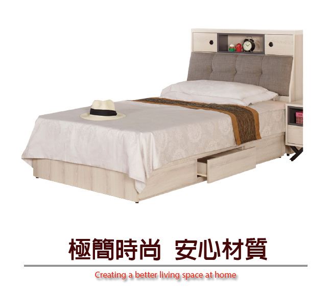 商品介紹 | 【綠家居】柏文 淺橡3.5尺單人棉麻布三抽床台組合(床頭箱+三抽床底+不含床墊) 淺橡木紋色系+現代簡約風格+安心材質製造,整體採用防蛀木心板+六分木床板+透氣棉麻布+高密度泡棉+防潮耐磨腳座等安心材質製造,產品外層採用防潮耐磨噴漆處理搭配採用可掀式床枕板+內&外開放層格+雙抽格+單邊開合三抽屜床底等收納空間設計,全由專人配送到家,專業安心服務,替你省下更多時間! 【商品特色】 淺橡木紋色系+現代簡約風格+安心材質製造,使用放心+搭配居家更便利 採用防蛀木心板+六分木床板+透氣棉麻布+高密度泡棉+防潮耐磨腳座等安心材質製造 產品外層採用防潮耐磨噴漆處理 搭配採用可掀式床枕板+內&外開放層格+雙抽格+單邊開合三抽屜床底等收納空間設計 此商品不需要DIY組立,此商品為組立後之成品 品質保證、專業設計、貼心服務 全由專人配送到家,專業安心服務,替您省下更多時間 |