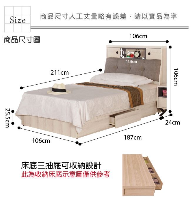 材質 | ◆產品名稱: 【綠家居】柏文 淺橡3.5尺單人棉麻布三抽床台組合(床頭箱+三抽床底+不含床墊) 床頭箱尺寸:(寬)106x(深)24(高)106/公分 床底尺寸:(寬)106x(深)187(高)25.5分 組合尺寸:(寬)106x(深)211(高)106/公分 ◆材質: 材質:防蛀木心板+六分木床板+透氣棉麻布+高密度泡棉+防潮耐磨腳座 噴漆:防潮耐磨噴漆處理