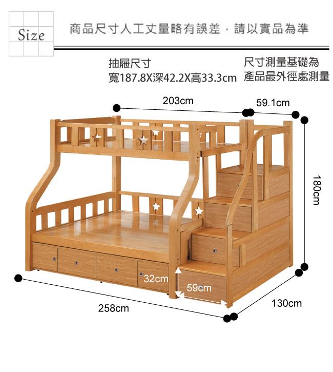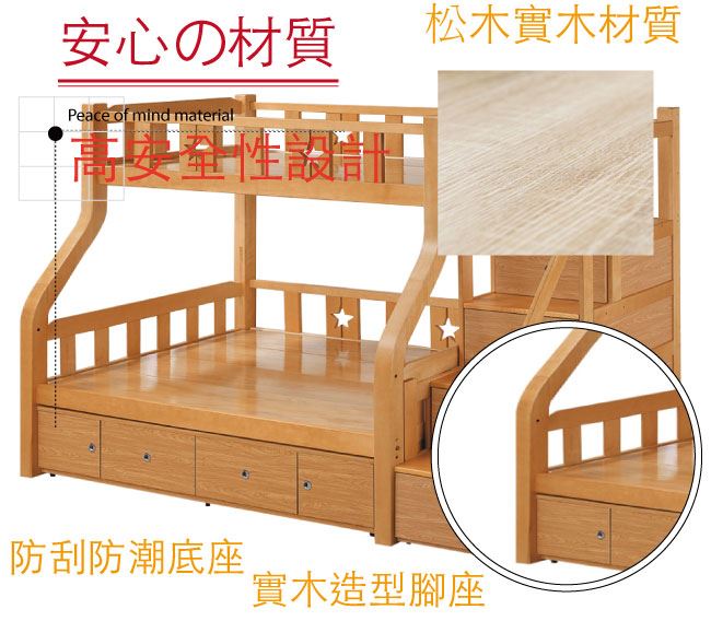 材質 | ◆產品名稱: 【綠家居】布諾 現代3.5尺單人實木雙層樓梯式床台 產品尺寸: 床台尺寸:(寬)130x(深)258x(高)180/公分 ◆材質: 材質:松木實木+實木木床板+防蛀木心板 塗漆:優利坦全包式耐磨噴漆處理