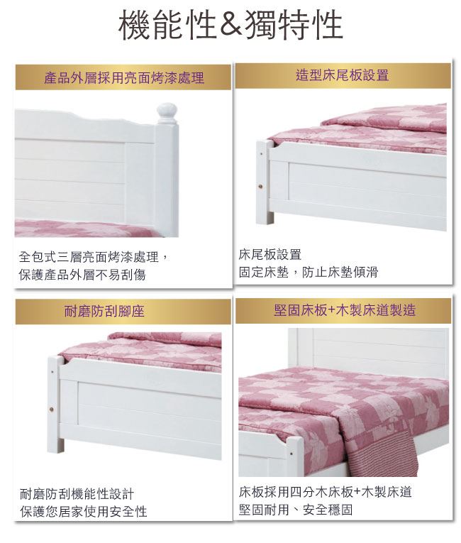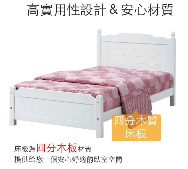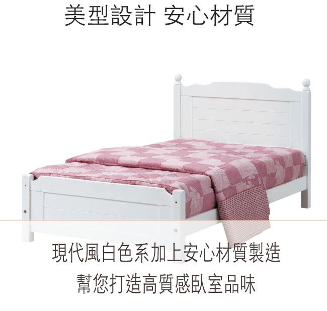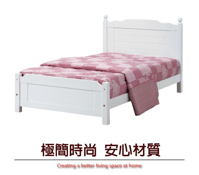 商品 介紹 | 【綠家居】米艾歐 法式白3.5尺單人實木床台(不含床墊) 法式白色系+現代簡約風格+安心材質製造,整體採用松木實木+四分木床板等安心材質製造,外層採用優利坦全包式亮面噴漆處理,全由專人配送到家,專業安心服務,替你省下更多時間! 【商品特色】 法式白色系+現代簡約風格+安心材質製造,使用放心+搭配居家更便利 採用松木實木+四分木床板等安心材質製造 此商品不需要DIY組立,此商品為組立後之成品 品質保證、專業設計、貼心服務 全由專人配送到家,專業安心服務,替您省下更多時間 |