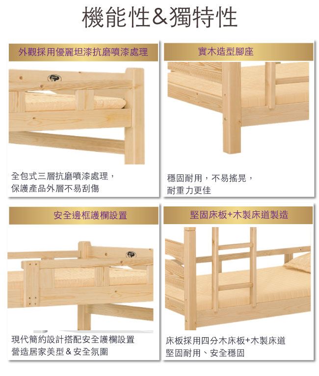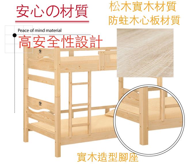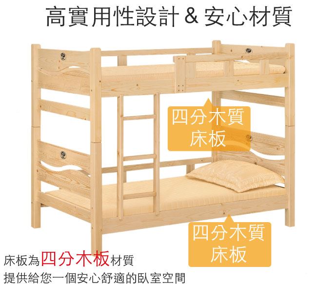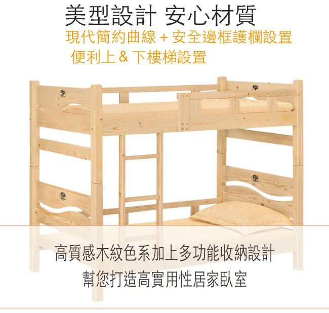 商品 介紹 | 【綠家居】達米歐 優雅風3.5尺單人實木雙層床台(不含床墊) 原木紋色系+現代簡約風格+安心材質製造,整體採用松木實木+四分木床板等安心材質製造搭配側邊安全護欄+簡易下上下樓梯設置等安心便利配置,外層採用優利坦全包式耐磨噴漆處理,全由專人配送到家,專業安心服務,替你省下更多時間! 【商品特色】 原木紋色系+現代簡約風格+安心材質製造,使用放心+搭配居家更便利 搭配側邊安全護欄+簡易下上下樓梯設置等安心便利配置 採用松木實木+四分木床板等安心材質製造 此商品不需要DIY組立,此商品為組立後之成品 品質保證、專業設計、貼心服務 全由專人配送到家,專業安心服務,替您省下更多時間 |