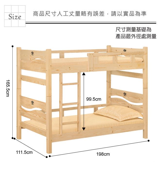 材質 | ◆產品名稱: 【綠家居】達米歐 優雅風3.5尺單人實木雙層床台(不含床墊) 產品尺寸: 雙層床台尺寸:(寬)111.5(深)198x(高)165.5/公分 ◆材質: 材質:松木實木+四分木床板 塗漆:優利坦全包式耐磨噴漆處理