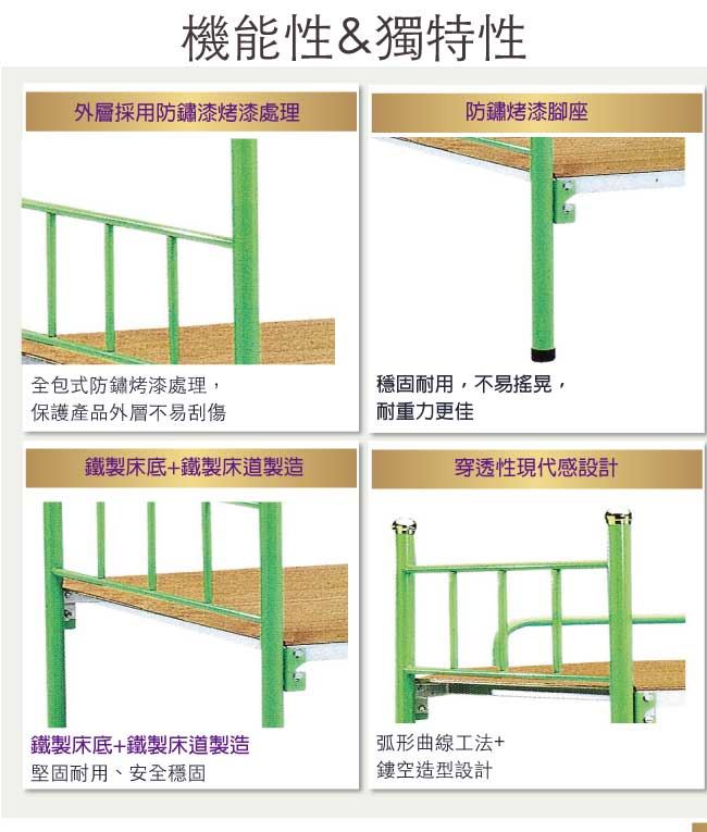 商品 介紹 | 【綠家居】康羅斯 青蘋果色3.1尺單人鐵製雙層床台組合 現代青蘋果色+現代簡約風格+安心材質製造,整體採用防鏽烤漆鐵製框架&底座+四分木床板等安心材質製造,外層採用全包式防鏽烤漆處理搭配側邊安全護欄+便利上下樓梯安全防護設計,全由專人配送到家,專業安心服務,替你省下更多時間! 【商品特色】 現代青蘋果色+現代簡約風格+安心材質製造,使用放心+搭配居家更便利 採用防鏽烤漆鐵製框架&底座+四分木床板等安心材質製造 搭配側邊安全護欄+便利上下樓梯安全防護設計 此商品不需要DIY組立,此商品為組立後之成品 品質保證、專業設計、貼心服務 全由專人配送到家,專業安心服務,替您省下更多時間 |