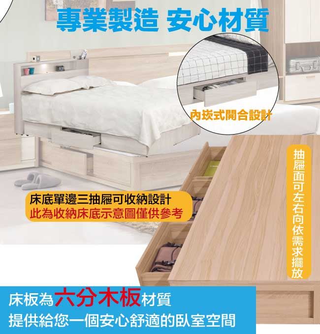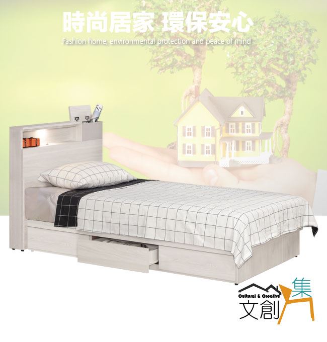 商品 介紹 | 【綠家居】摩克3.5尺夜燈單人三抽床台組合(床頭片+三抽床底+不含床墊) 淺橡木紋色系+現代簡約風格+安心材質製造,整體採用防蛀木心板+六分木床板+防潮耐磨腳座等安心材質製造,產品外層採用防潮耐磨噴漆處理搭配採用開放層格+便利夜燈設置+床底單邊開合三抽屜等收納空間設計,全由專人配送到家,專業安心服務,替你省下更多時間! 【商品特色】 淺橡木紋色系+現代簡約風格+安心材質製造,使用放心+搭配居家更便利 採用防蛀木心板+六分木床板+防潮耐磨腳座等安心材質製造 產品外層採用防潮耐磨噴漆處理 搭配採用開放層格+便利夜燈設置+床底單邊開合三抽屜等收納空間設計 此商品不需要DIY組立,此商品為組立後之成品 品質保證、專業設計、貼心服務 全由專人配送到家,專業安心服務,替您省下更多時間 |