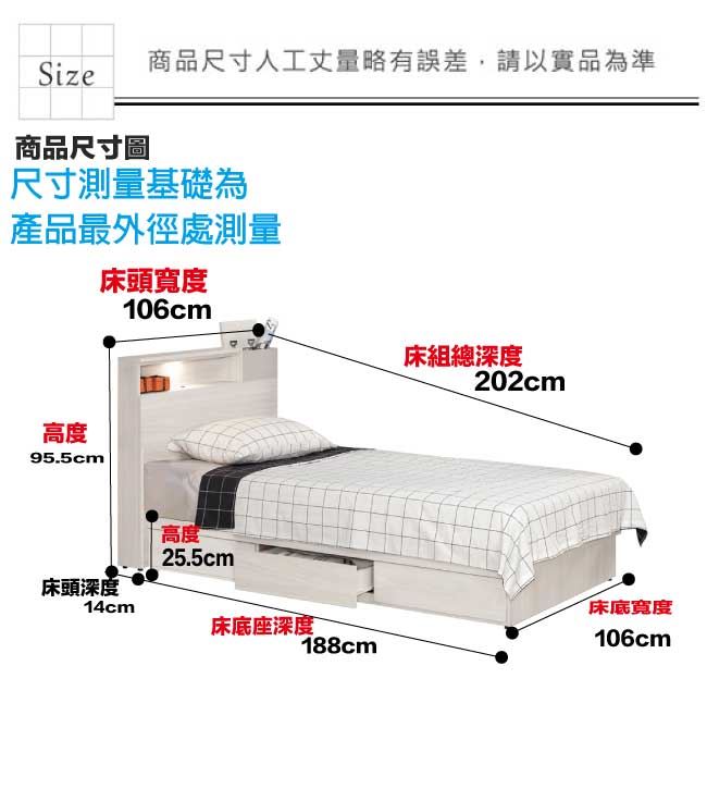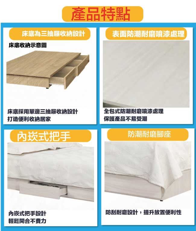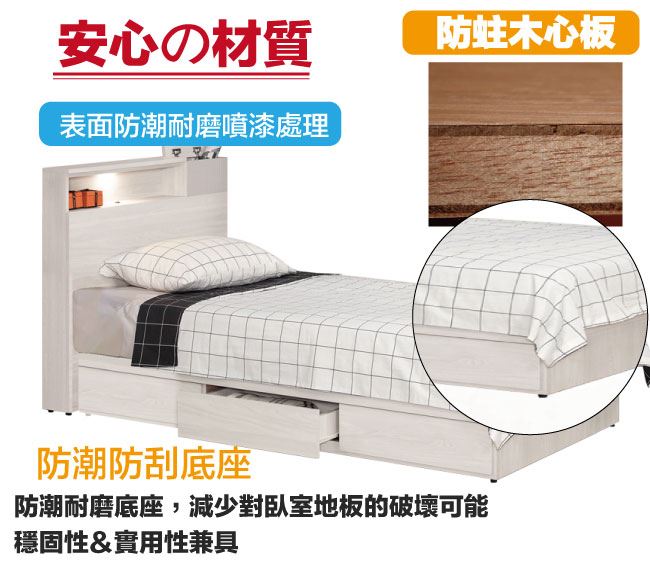 材質 | ◆產品名稱:【綠家居】摩克3.5尺夜燈單人三抽床台組合(床頭片+三抽床底+不含床墊) 床頭尺寸:(寬)106x(深)14(高)95.5/公分 床底尺寸:(寬)106x(深)188(高)25.5/公分 床台組合尺寸:(寬)106x(深)202(高)95.5/公分 ◆材質: 材質:防蛀木心板+六分木床板+防潮耐磨腳座 噴漆:防潮耐磨噴漆處理
