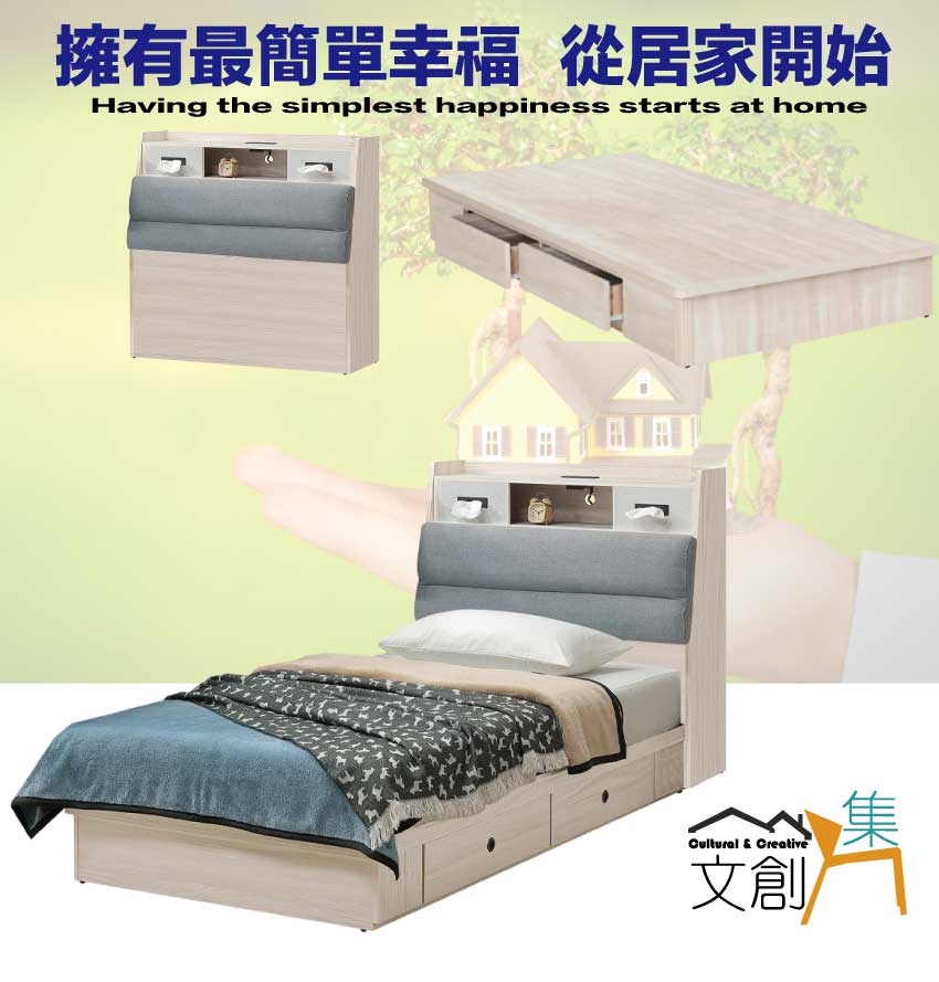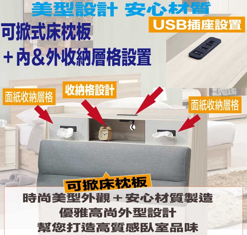 搭配床頭箱採用可掀式床枕板+內&外開放式層格+便利插座設置加上床底採用單邊開合二抽屜等收納空間設計