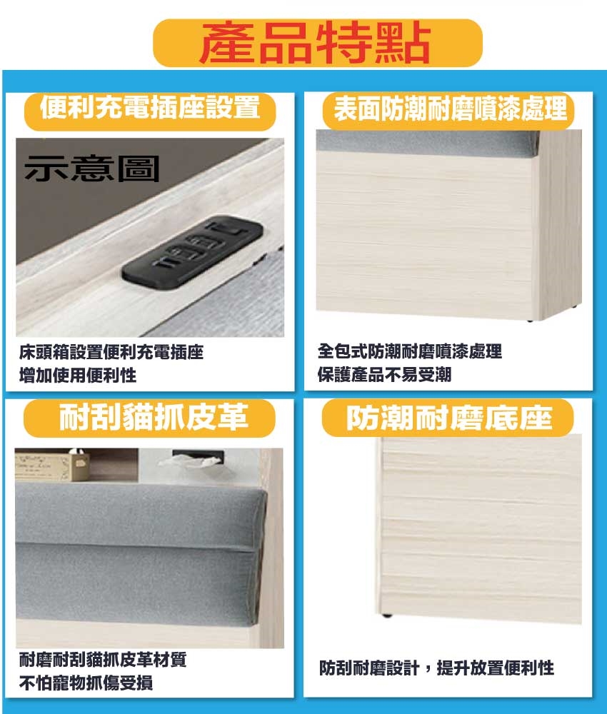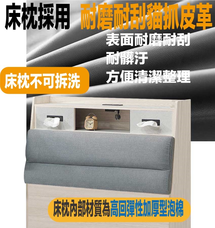 材質:防蛀木心板+六分木床板+防潮耐磨底座+耐刮貓抓皮革+高回彈泡棉