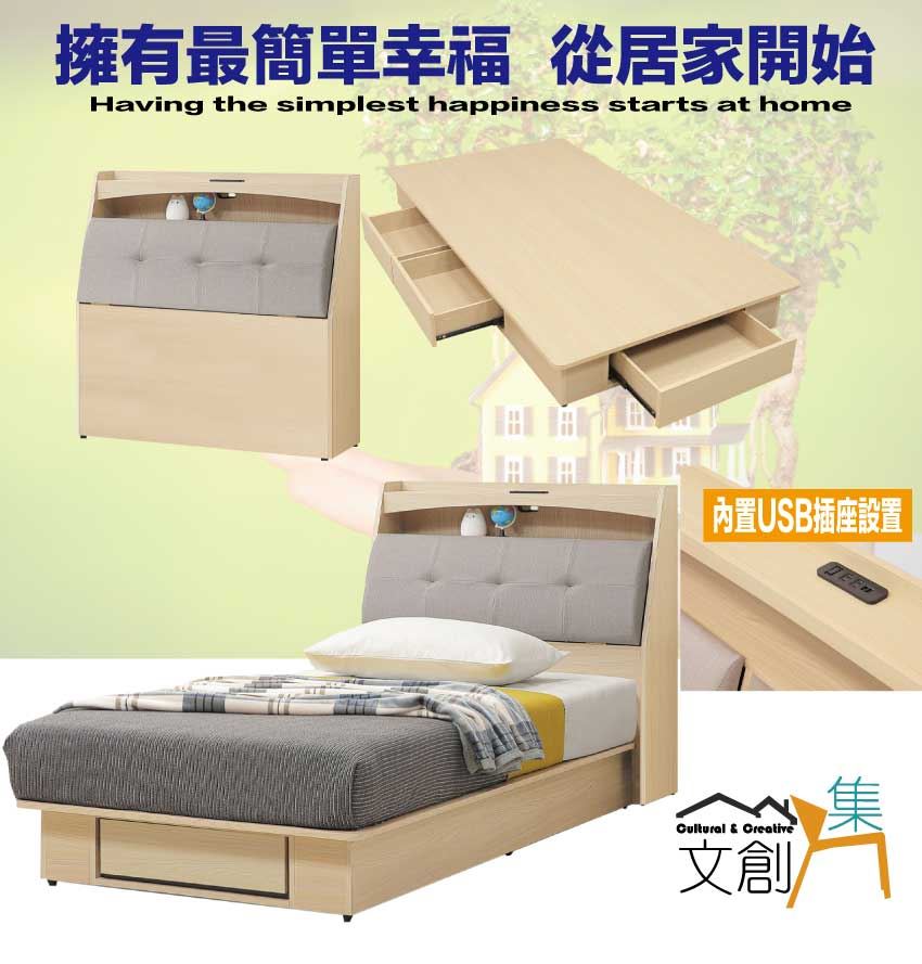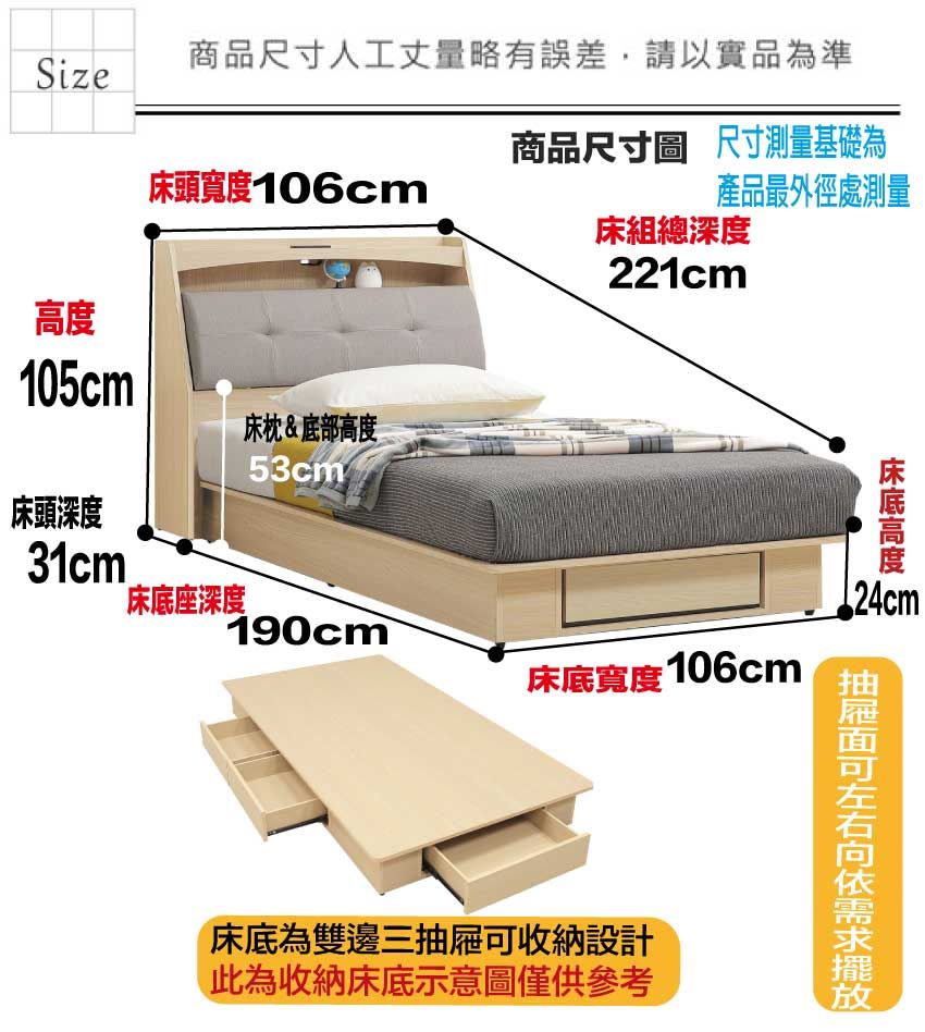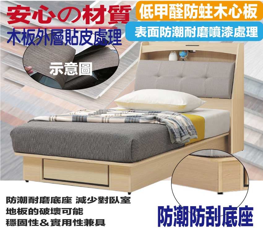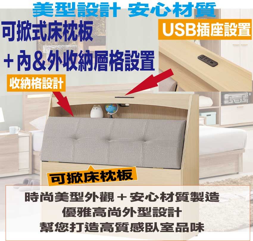 搭配床頭可掀式床枕板+內&外開放層格+便利插座設置加床底座雙邊開合三抽屜等收納空間設計