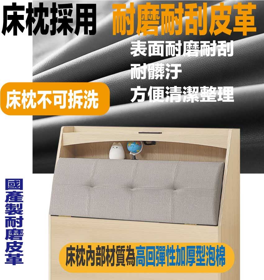 材質:防蛀木心板+六分木床板+防潮耐磨底座+耐磨耐刮皮革+高彈力泡棉