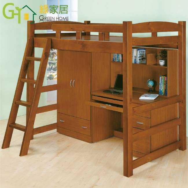 商品介紹 | 【綠家居】 波特 時尚3.5尺實木單人多功能高床台組合(床台+衣櫃+書桌) 優雅外觀造型,整體採用松木實木+防蛀木心板+四分木床板+優利坦耐磨三層全包式塗漆等材質設計 ,搭配單人床台+衣櫃+書桌組合+便利樓梯架+安全邊框護欄等收納空間設計,全由專人配送到家,專業安心服務,替你省下更多時間! 【商品特色】 樟木紋色系+現代簡約風格+安心材質製造,使用放心+搭配居家更便利 松木實木+防蛀木心板+四分木床板等安心材質製造,結構牢固耐用 此商品不需要DIY組立,此商品為組立後之成品 品質保證、專業設計、貼心服務 全由專人配送到家,專業安心服務,替您省下更多時間