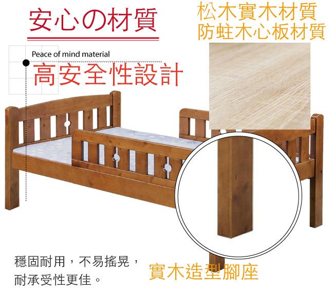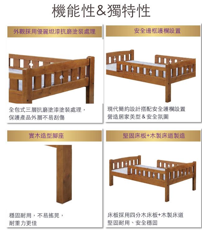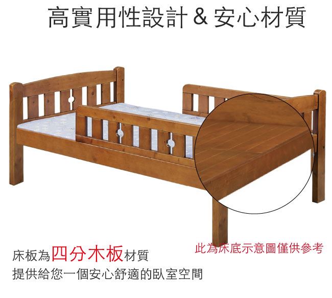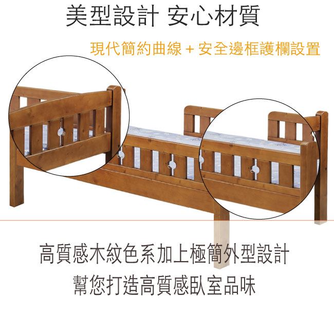 商品介紹 | 【綠家居】開羅 現代3.5尺單人實木床台組合(不含床墊) 樟木紋色系+現代簡約風格+安心材質製造,整體採用松木實木+防蛀木心板+四分木床板等安心材質製造,外層採用優利坦全包式耐磨噴漆處理搭配床架二側採用安全護欄邊框設置,確保睡眠安全性,全由專人配送到家,專業安心服務,替你省下更多時間! 【商品特色】 樟木紋色系+現代簡約風格+安心材質製造,使用放心+搭配居家更便利 採用松木實木+防蛀木心板+四分木床板等安心材質製造 床架二側採用安全護欄邊框設置,確保睡眠安全性 此商品不需要DIY組立,此商品為組立後之成品 品質保證、專業設計、貼心服務 全由專人配送到家,專業安心服務,替您省下更多時間 |
