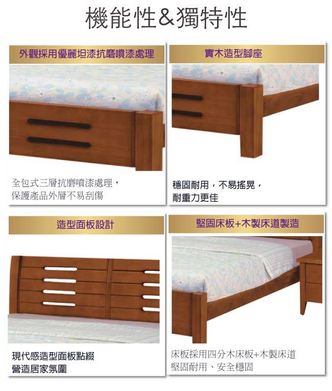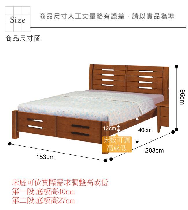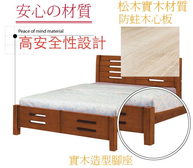 材質 | ◆產品名稱: 【綠家居】畢吉歐 樟木紋5尺雙人實木床台(不含床墊) 產品尺寸: 床台尺寸:(寬)153(深)203x(高)96/公分 床板可做二段式高低調整功能性設計 ◆材質: 材質:松木實木+四分木床板+防潮實木底座 塗漆:優利坦全包式耐磨噴漆處理