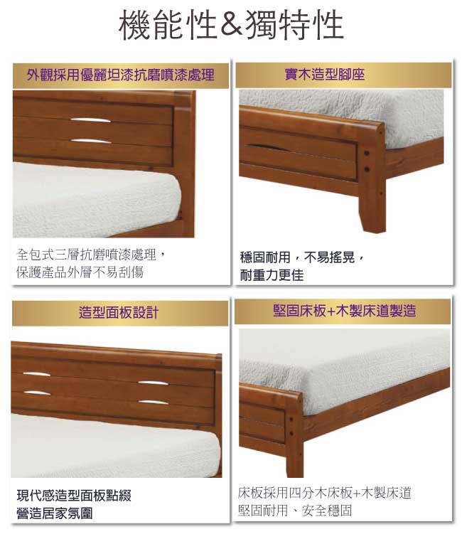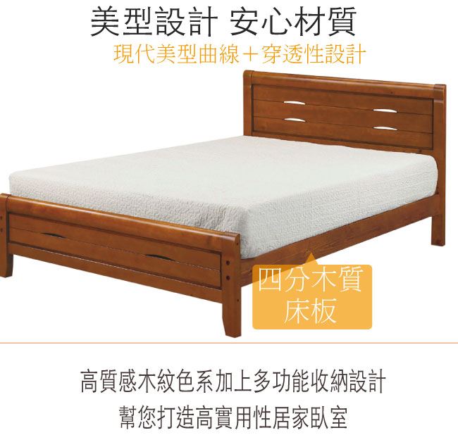 商品介紹 | 【綠家居】卡因 樟木紋5尺雙人實木床台(不含床墊) 樟木紋色系+現代簡約風格+安心材質製造,整體採松木實木+四分木床板+防潮實木底座等安心材質製造,外層採用優利坦全包式耐磨噴漆處理,全由專人配送到家,專業安心服務,替你省下更多時間! 【商品特色】 樟木紋色系+現代簡約風格+安心材質製造,使用放心+搭配居家更便利 採用松木實木+四分木床板+防潮實木底座等安心材質製造 此商品不需要DIY組立,此商品為組立後之成品 品質保證、專業設計、貼心服務 全由專人配送到家,專業安心服務,替您省下更多時間 |
