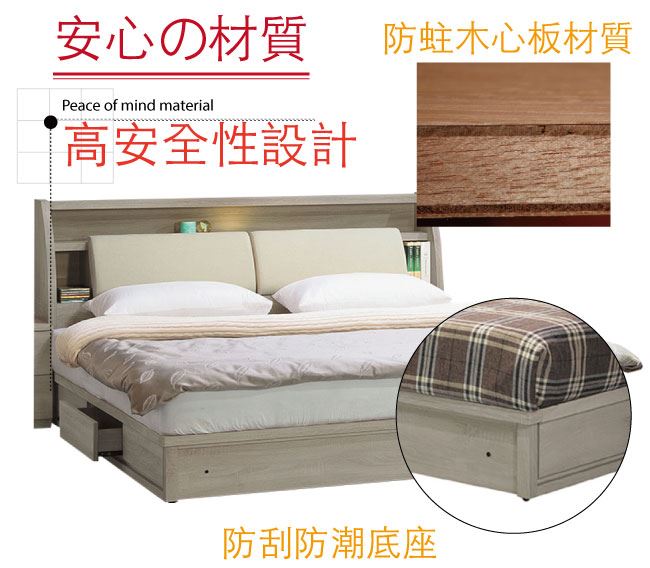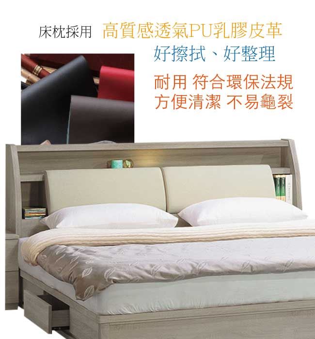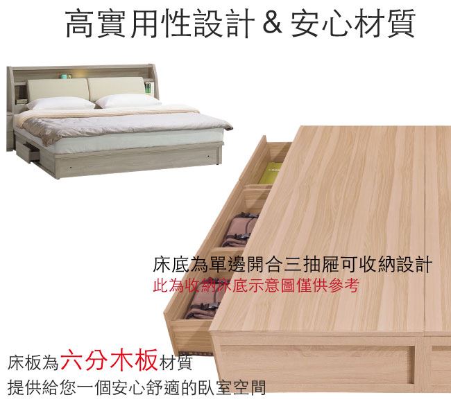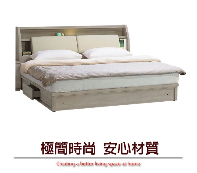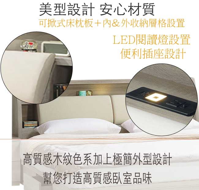 商品介紹 | 【綠家居】歐倫勒 現代5尺雙人皮革三抽床台組合(床頭箱+三抽床底+不含床墊) 橡木紋色系+現代簡約風格+安心材質製造,整體採用防蛀木心板+透氣PU皮革+高密度泡棉+六分木床板+防潮耐磨底座等安心材質製造,外層採用優利坦全包式耐磨噴漆處理搭配採用可掀式床頭枕板+開放&隱藏式收納層格+LED閱讀燈+便利插座設置+單邊開合收納三抽屜等便利設計,全由專人配送到家,專業安心服務,替你省下更多時間! 【商品特色】 橡木紋色系+現代簡約風格+安心材質製造,使用放心+搭配居家更便利 採用防蛀木心板+透氣PU皮革+高密度泡棉+六分木床板+防潮耐磨底座等安心材質製造 採用可掀式床頭枕板+開放&隱藏式收納層格+LED閱讀燈+便利插座設置+單邊開合收納三抽屜等便利設計 此商品不需要DIY組立,此商品為組立後之成品 品質保證、專業設計、貼心服務 全由專人配送到家,專業安心服務,替您省下更多時間 |