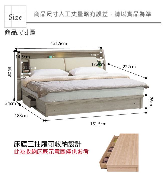 材質 | ◆產品名稱: 【綠家居】歐倫勒 現代5尺雙人皮革三抽床台組合(床頭箱+三抽床底+不含床墊) 產品尺寸: 床頭尺寸:(寬)151.5(深)34x(高)98/公分 床底尺寸:(寬)151.5x(深)188x(高)26/公分 組合尺寸:(寬)151.5x(深)222x(高)98/公分 ◆材質: 材質:防蛀木心板+透氣PU皮革+高密度泡棉+六分木床板+防潮耐磨底座 塗漆:優利坦全包式耐磨噴漆處理