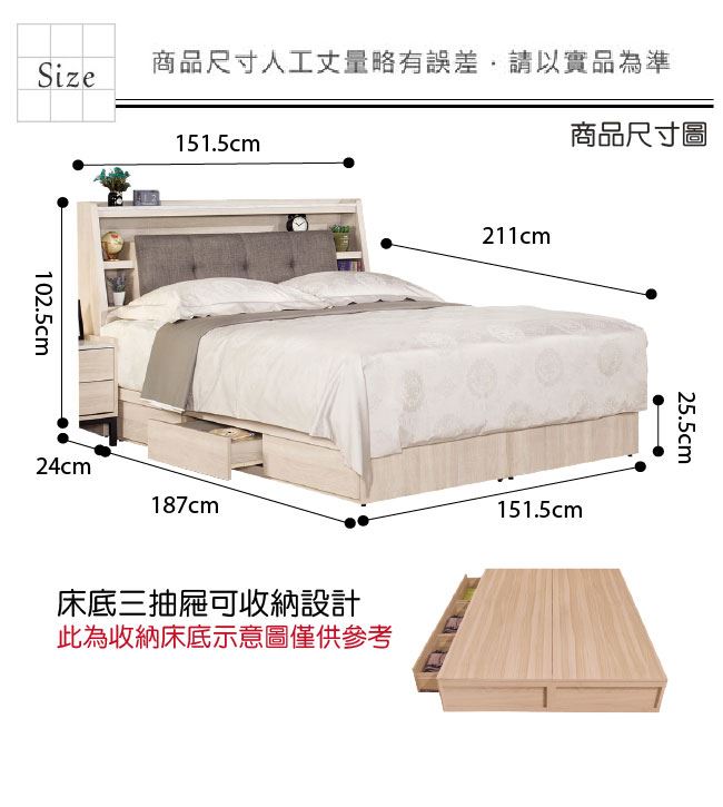 材質 | ◆產品名稱: 【綠家居】海多娜 橡木紋5尺雙人棉麻布三抽床台組合(床頭箱+三抽床底+不含床墊) 床頭箱尺寸:(寬)151.5x(深)24(高)102.5/公分 床底尺寸:(寬)151.5x(深)187(高)25.5分 組合尺寸:(寬)151.5x(深)211(高)102.5/公分 ◆材質: 材質:防蛀木心板+六分木床板+透氣棉麻布+高密度泡棉+防潮耐磨腳座 噴漆:防潮耐磨噴漆處理