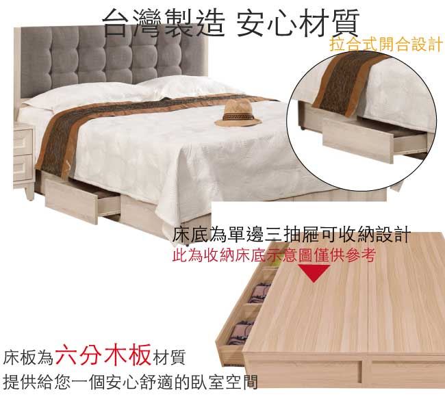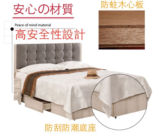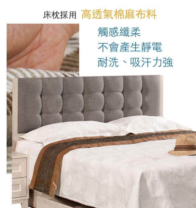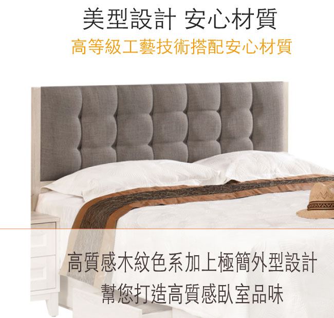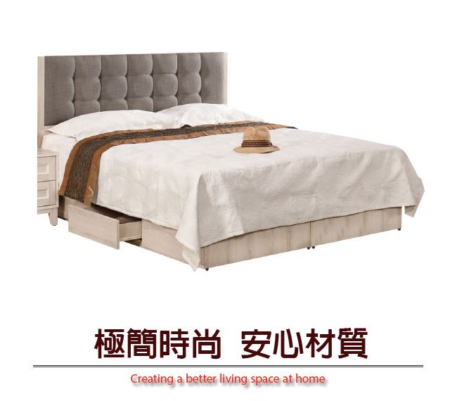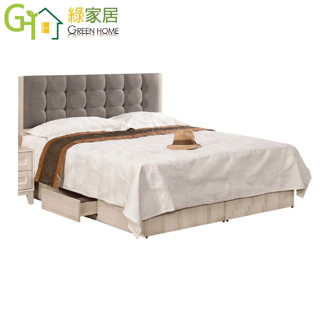 商品介紹 | 【綠家居】艾嘉柏 淺橡6尺雙人加大棉麻布三抽床台組合(床頭片+三抽床底+不含床墊) 淺橡木紋色系+現代簡約風格+安心材質製造,整體採用防蛀木心板+六分木床板+透氣棉麻布+高密度泡棉+防潮耐磨腳座等安心材質製造,產品外層採用防潮耐磨噴漆處理搭配採用單邊開合三抽屜床底收納空間設計,全由專人配送到家,專業安心服務,替你省下更多時間! 【商品特色】 淺橡木紋色系+現代簡約風格+安心材質製造,使用放心+搭配居家更便利 採用防蛀木心板+六分木床板+透氣棉麻布+高密度泡棉+防潮耐磨腳座等安心材質製造 產品外層採用防潮耐磨噴漆處理 搭配採用單邊開合三抽屜床底收納空間設計 此商品不需要DIY組立,此商品為組立後之成品 品質保證、專業設計、貼心服務 全由專人配送到家,專業安心服務,替您省下更多時間 |