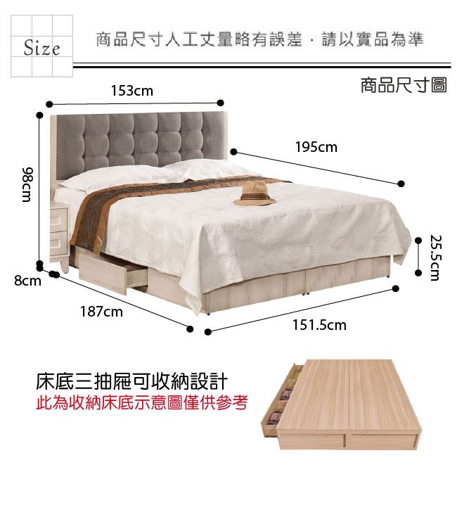材質 | ◆產品名稱: 【綠家居】艾嘉柏 淺橡5尺雙人棉麻布三抽床台組合(床頭片+三抽床底+不含床墊) 床頭片尺寸:(寬)153x(深)8(高)98/公分 床底尺寸:(寬)151.5x(深)187(高)25.5分 組合尺寸:(寬)153x(深)195(高)98/公分 ◆材質: 材質:防蛀木心板+六分木床板+透氣棉麻布+高密度泡棉+防潮耐磨腳座 噴漆:防潮耐磨噴漆處理