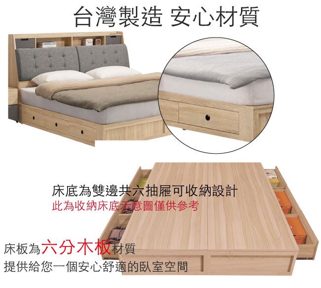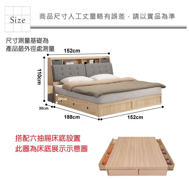 材質 | ◆產品名稱: 【綠家居】科羅利 亞麻布5尺雙人六抽床台組合(二色可選+床頭箱+六抽床底+不含床墊) 產品尺寸: 木紋雙色 床頭尺寸:(寬)152(深)30x(高)110/公分 床底尺寸:(寬)152x(深)188x(高)26/公分 組合尺寸:(寬)152x(深)218x(高)110/公分 木紋白雙色 床頭尺寸:(寬)152(深)30x(高)113/公分 床底尺寸:(寬)152x(深)188x(高)26/公分 組合尺寸:(寬)152x(深)218x(高)113/公分 ◆材質: 材質:防蛀木心板+透氣亞麻布+高密度泡棉+六分木床板+防潮耐磨底座 塗漆:優利坦全包式耐磨噴漆處理