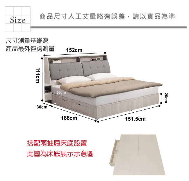 材質 | ◆產品名稱: 【綠家居】古利德 現代5尺雙人亞麻布二抽床台組合(床頭箱+二抽床底+不含床墊) 產品尺寸: 木紋雙色 床頭尺寸:(寬)152(深)30x(高)111/公分 床底尺寸:(寬)151.5x(深)188x(高)26/公分 組合尺寸:(寬)152x(深)218x(高)111/公分 ◆材質: 材質:防蛀木心板+透氣亞麻布+高密度泡棉+六分木床板+防潮耐磨底座 塗漆:優利坦全包式耐磨噴漆處理