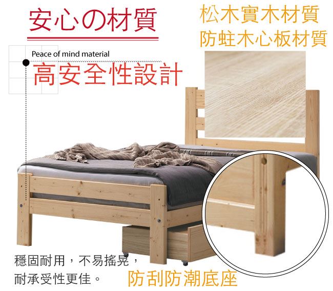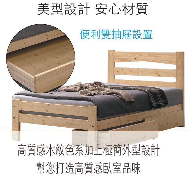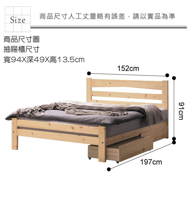 材質 | ◆產品名稱: 【綠家居】麥歐 現代5尺雙人實木收納床台組合(床台+雙抽屜+不含床墊) 產品尺寸: 尺寸:(寬)152(深)197x(高)91/公分 ◆材質: 材質:松木實木+實木木床板+便利滑輪設置 塗漆:優利坦全包式耐磨噴漆處理