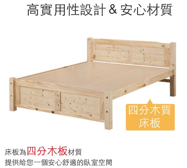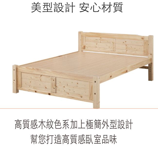 商品 介紹 | 【綠家居】艾歐 現代5尺雙人實木床台(不含床墊) 松木紋色系+現代簡約風格+安心材質製造,整體採用松木實木+四分木床板等安心材質製造,外層採用優利坦全包式耐磨噴漆處理,全由專人配送到家,專業安心服務,替你省下更多時間! 【商品特色】 松木紋色系+現代簡約風格+安心材質製造,使用放心+搭配居家更便利 採用松木實木+四分木床板等安心材質製造 此商品不需要DIY組立,此商品為組立後之成品 品質保證、專業設計、貼心服務 全由專人配送到家,專業安心服務,替您省下更多時間 |