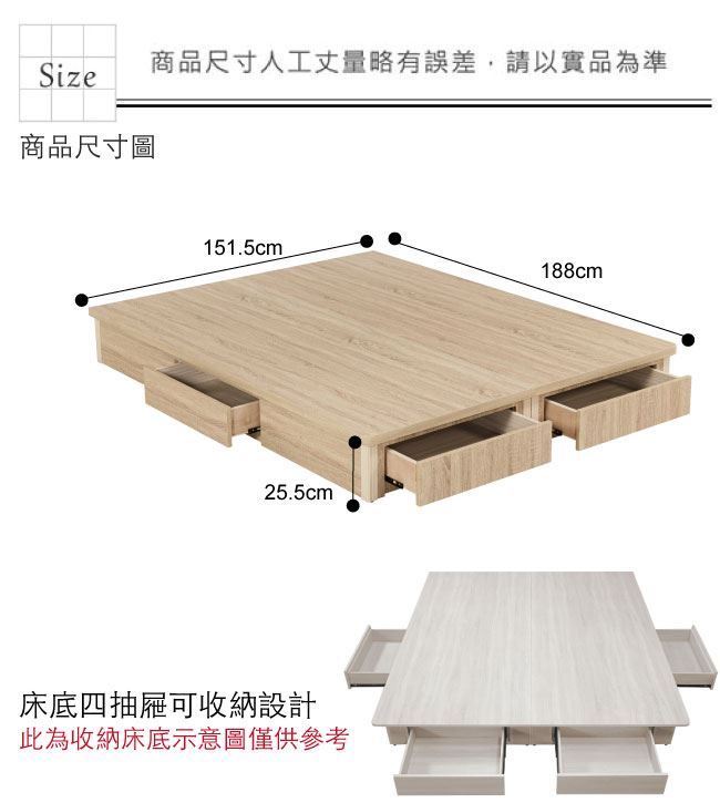 床底尺寸:(寬)151.5x(深)188高)25.5公分 ◆材質: 材質:防蛀木心板+六分木床板+防潮耐磨腳座 噴漆:防潮耐磨噴漆處理