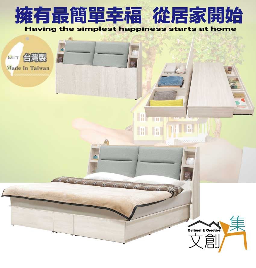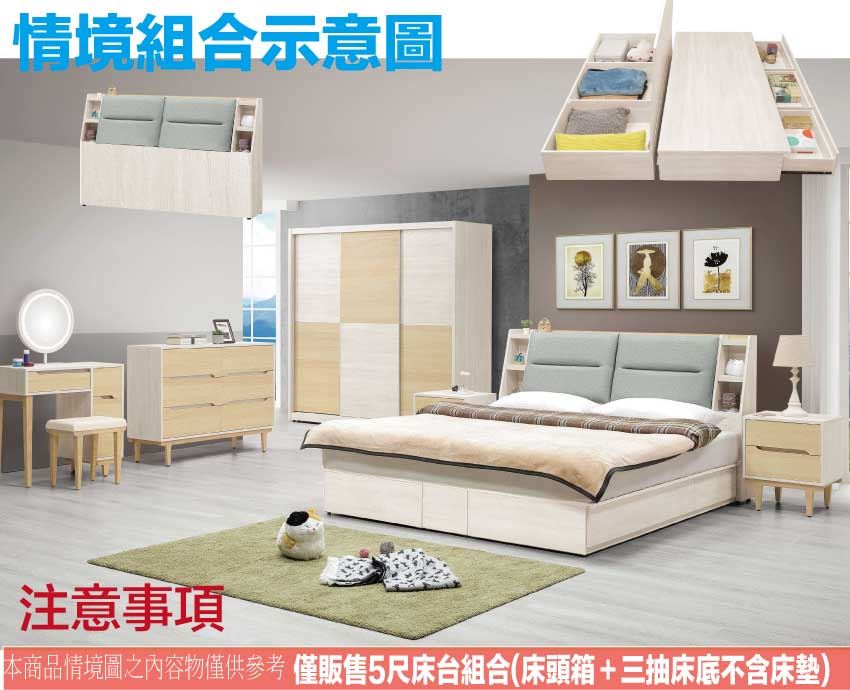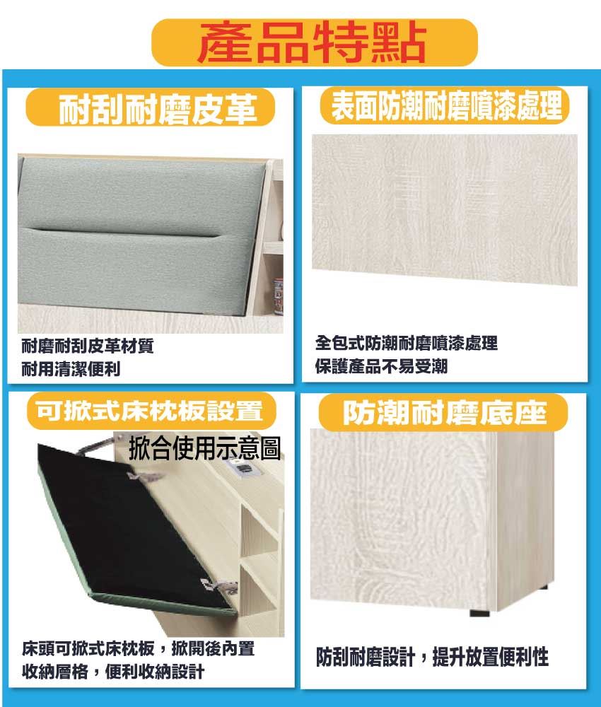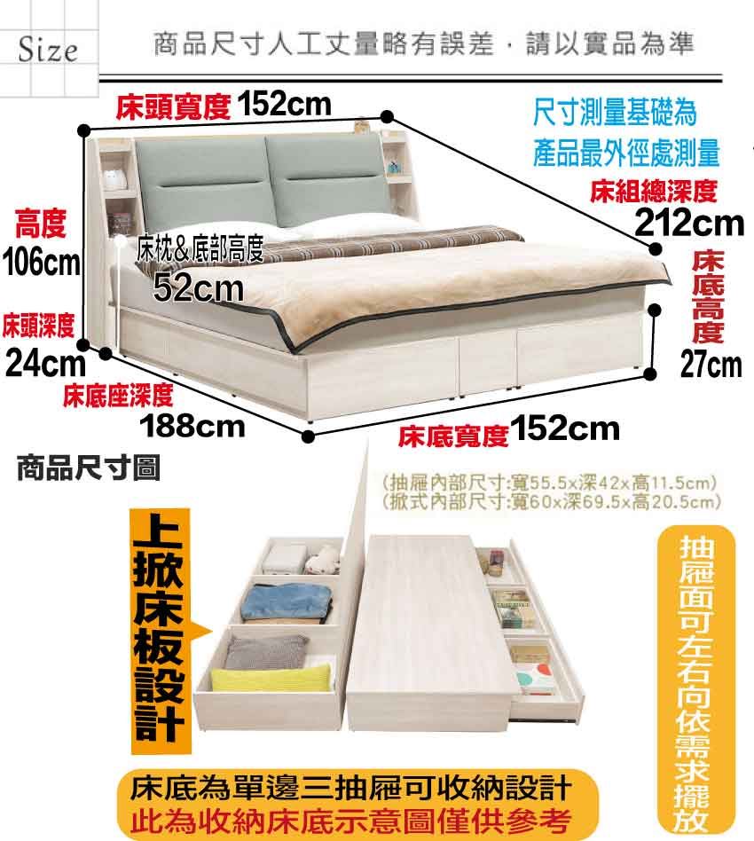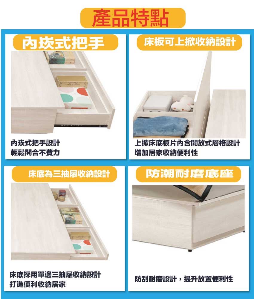 搭配床頭可掀式床枕板+內&外開放層格+床底座單邊開合三抽屜+床底板可上掀內可置物等收納空間設計