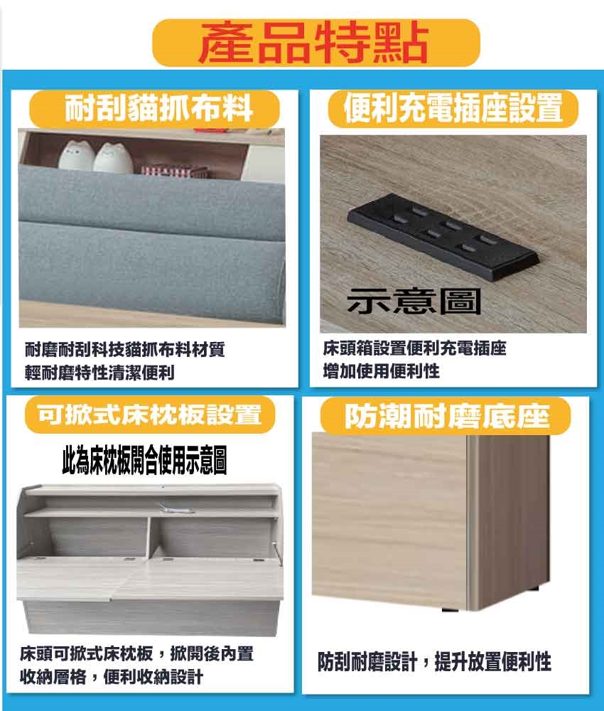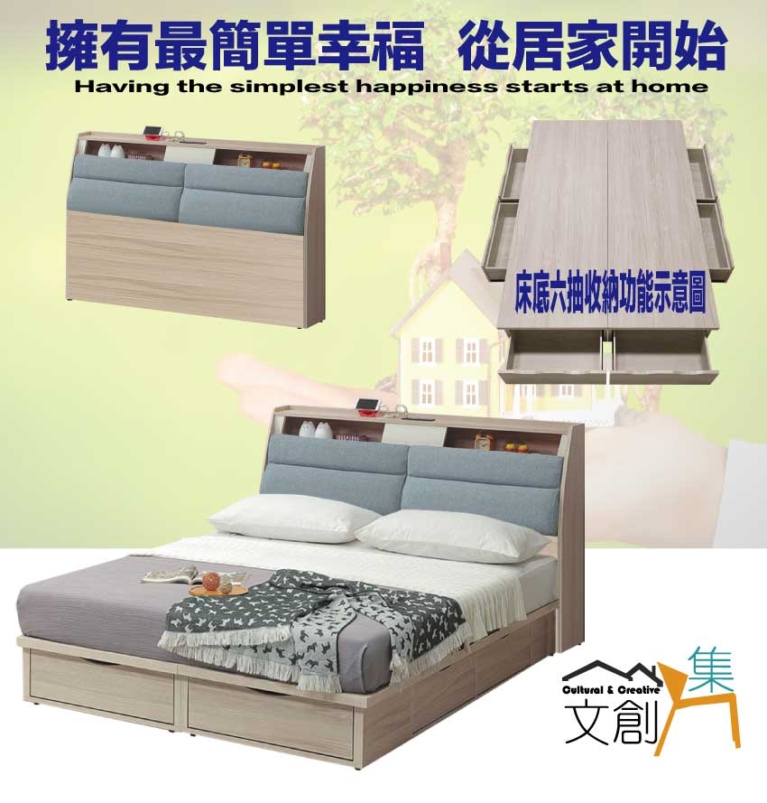 搭配床頭箱可掀式床枕板+內&外收納層格+便利插座設置+床底座三邊開合六抽屜等收納空間設計