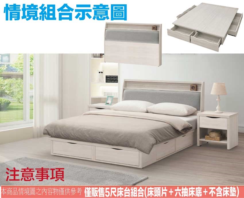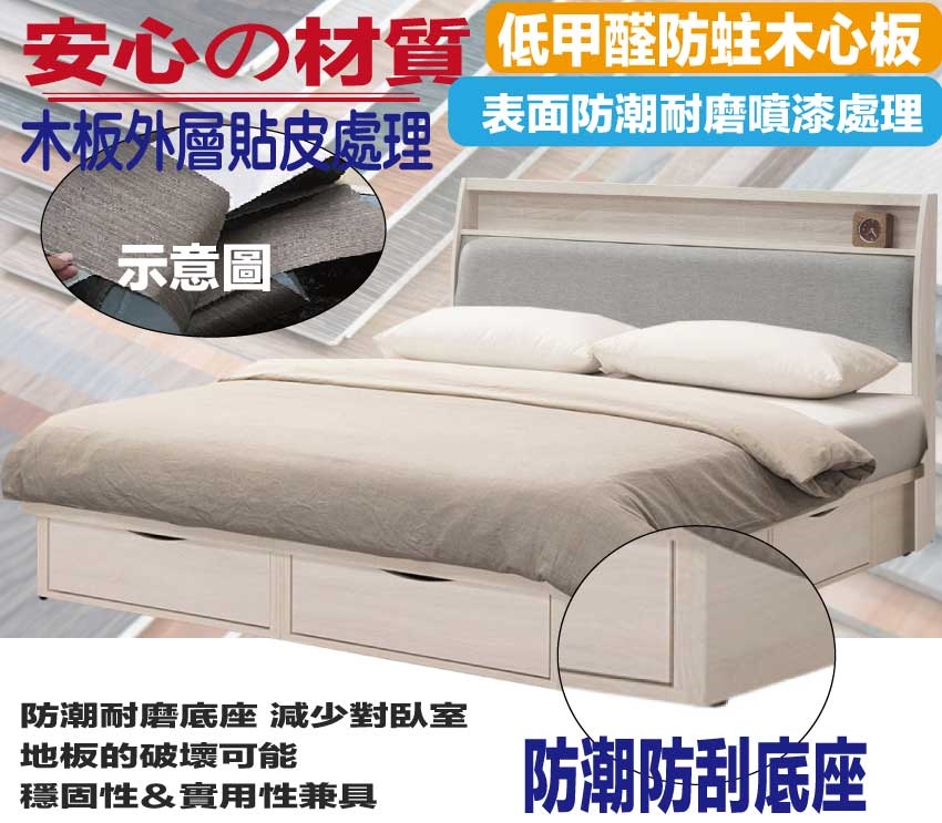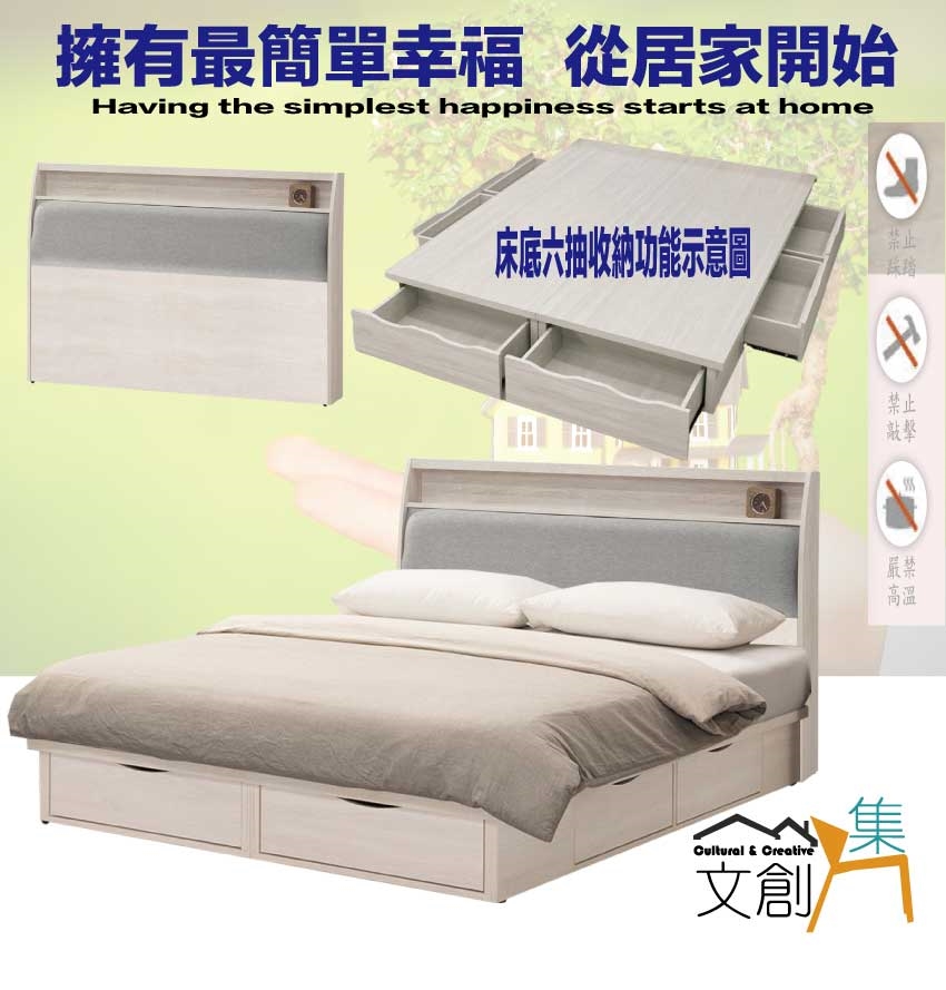 搭配採用床底座三邊開合六抽屜收納空間設計