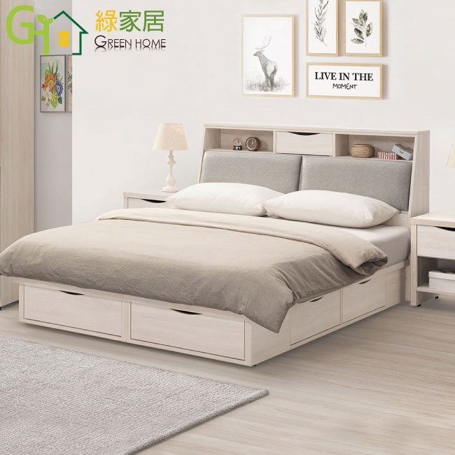 ★偏遠地區需額外加收運費,下標請先問與答詢問★ ★下訂前注意 由於商品流動較快,下訂前請先詢問是否有貨在下訂喔~★ 【綠家居】海島5尺雙人貓抓皮革六抽床台組合(床頭箱+六抽床底+不含床墊) 淺橡木紋色系+現代簡約風格+安心材質製造,整體採用防蛀木心板+六分木床板+防潮耐磨底座+耐磨貓抓皮革+高回彈泡棉等安心材質製造,產品外層採用防潮耐磨噴漆處理搭配採用床頭箱可掀式床枕板+內&外收納層格+床底座三邊開合六抽屜等收納空間設計,全由專人配送到家,專業安心服務,替你省下更多時間!