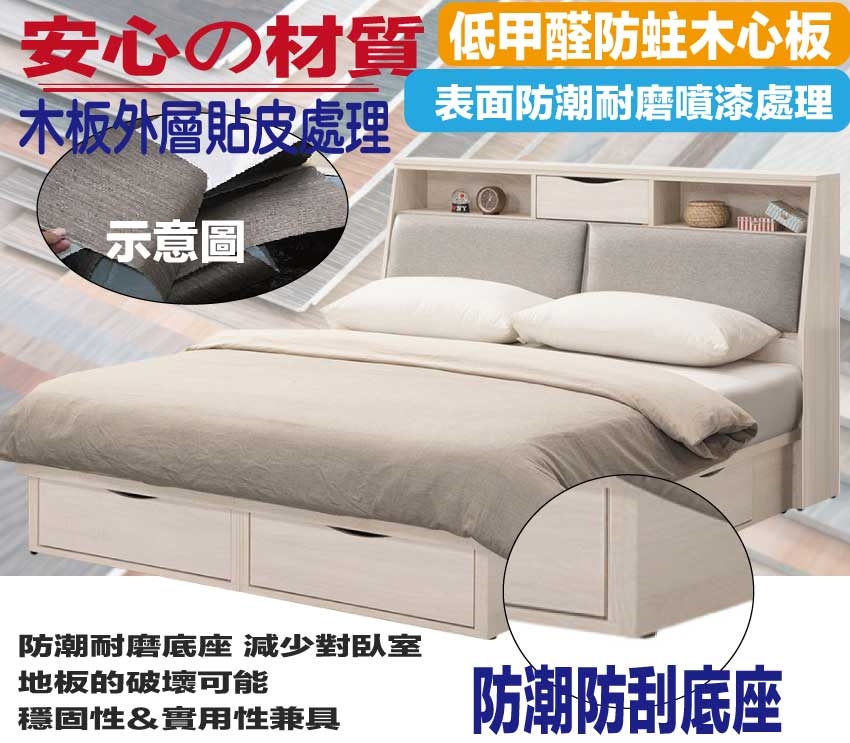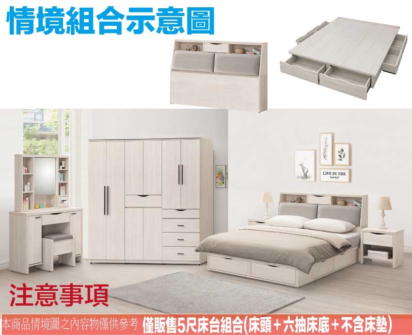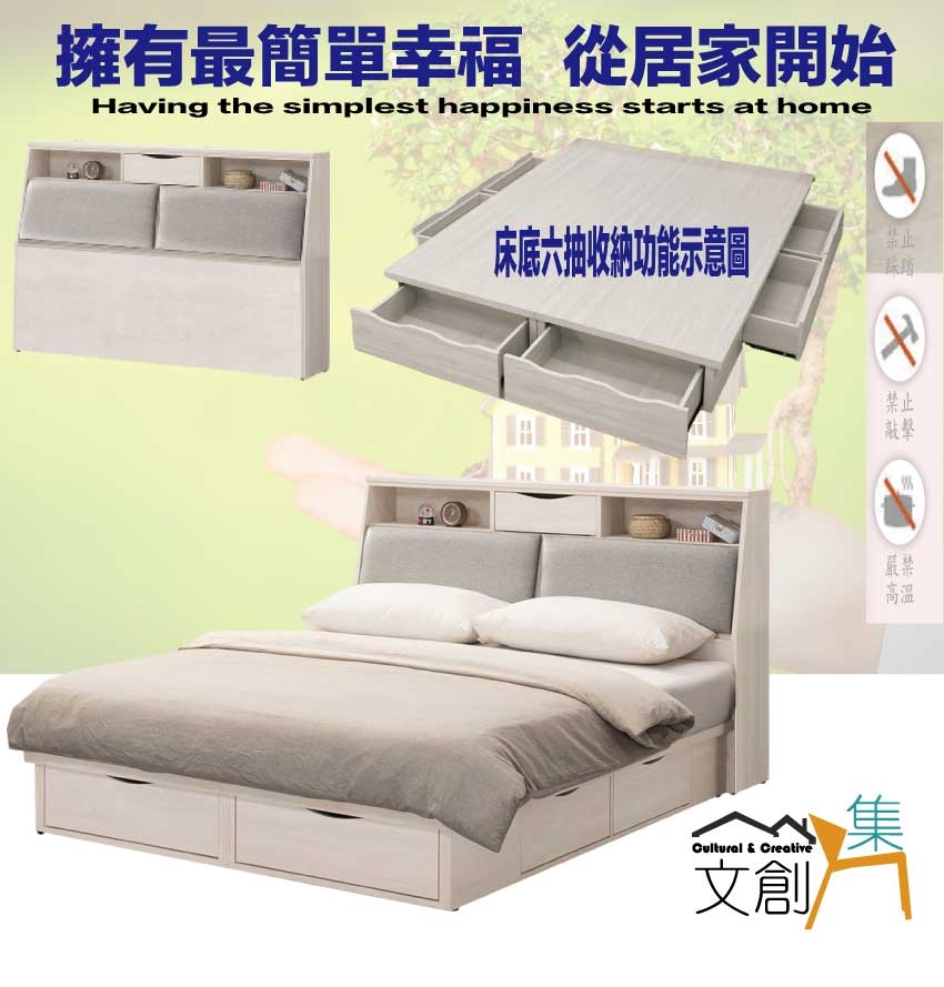 搭配採用床頭箱可掀式床枕板+內&外收納層格+床底座三邊開合六抽屜等收納空間設計