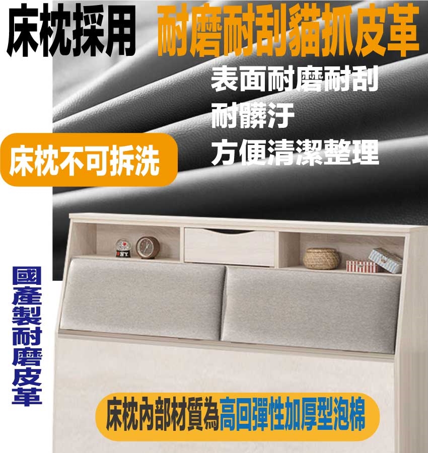 材質:防蛀木心板+六分木床板+防潮耐磨底座+耐磨耐刮皮革+高回彈泡棉 -