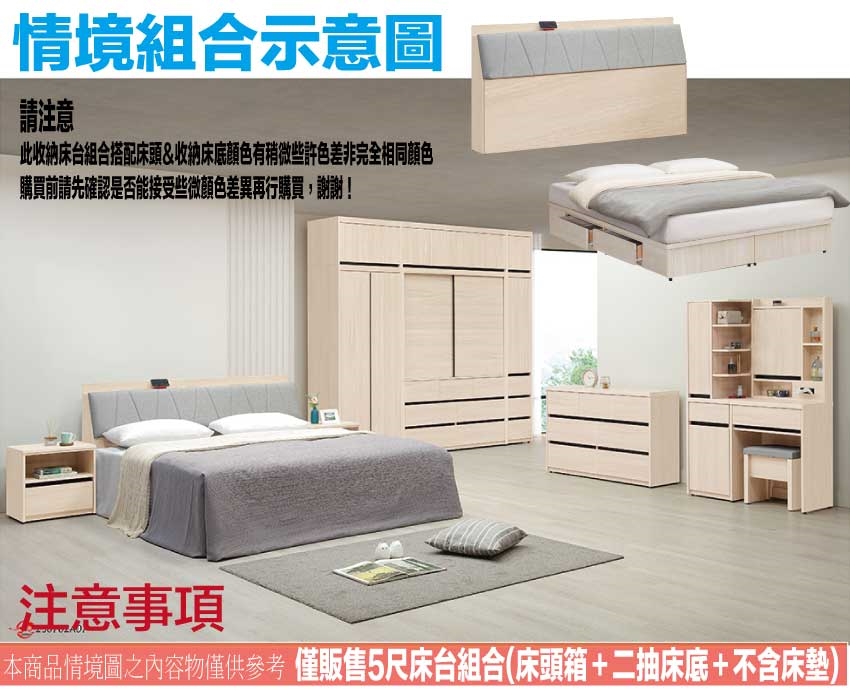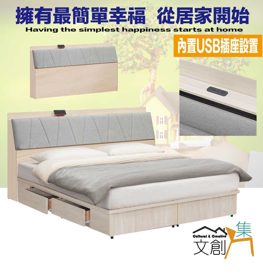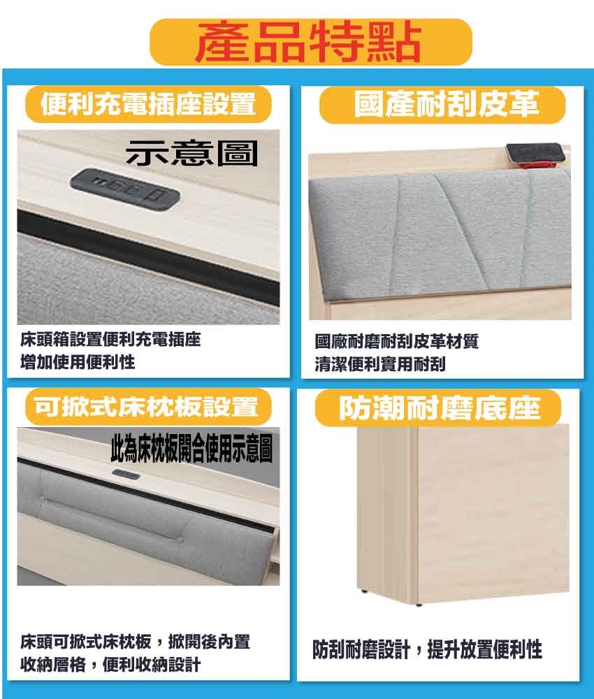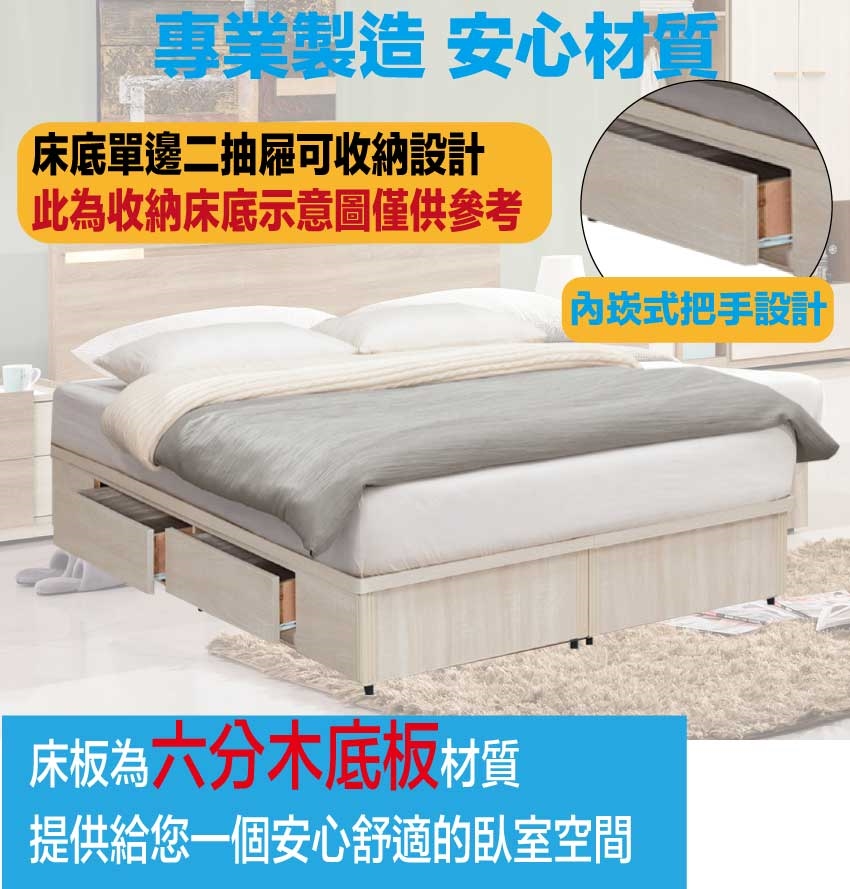 搭配採用床頭箱可掀式床枕板+內&外收納層格+便利插座設置+床底座單邊開合二抽屜等收納空間設計