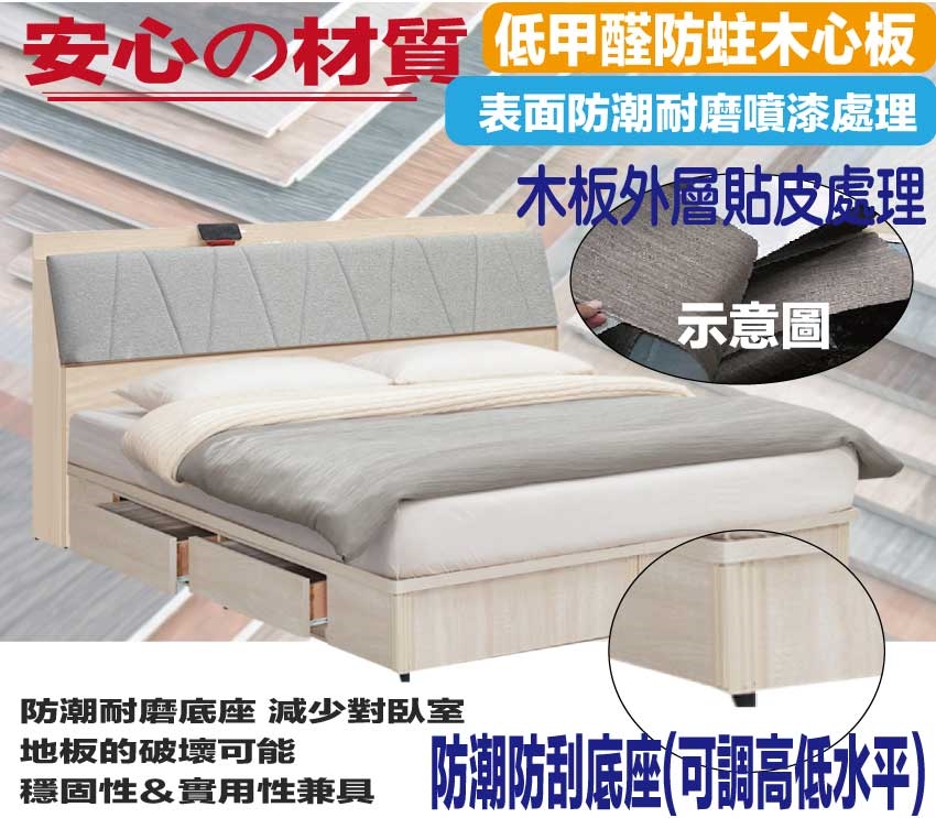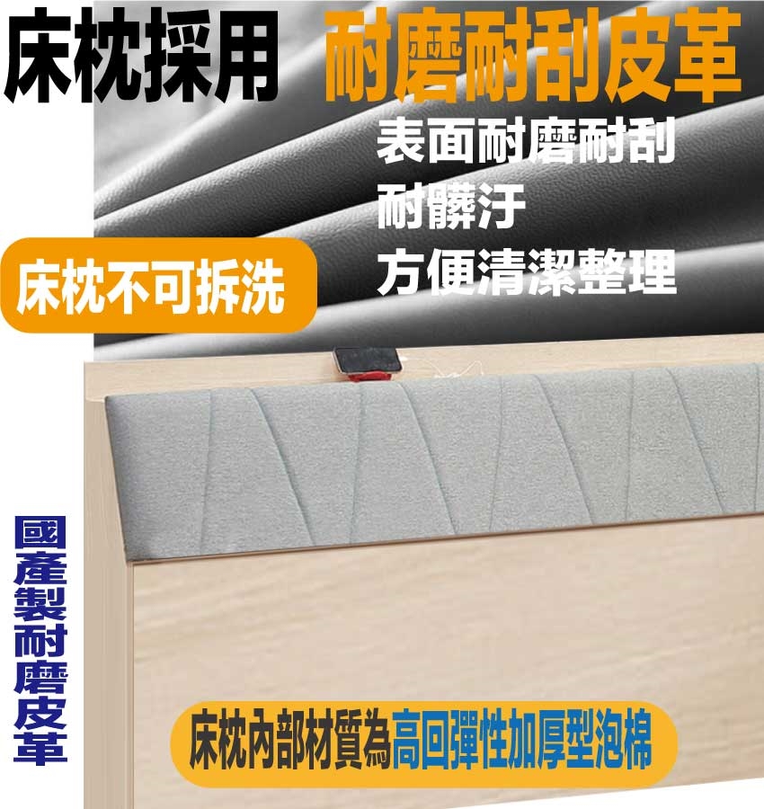材質:防蛀木心板+六分木床板+防潮耐磨底座+耐磨耐刮皮革+高回彈泡棉