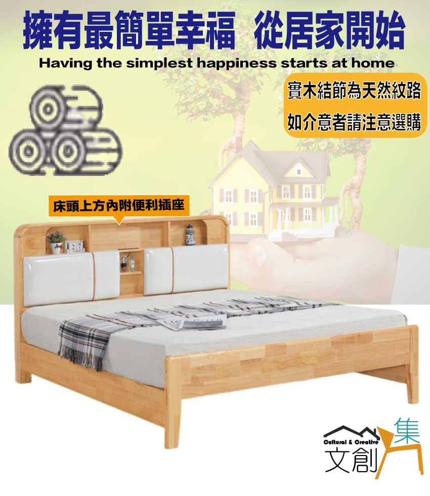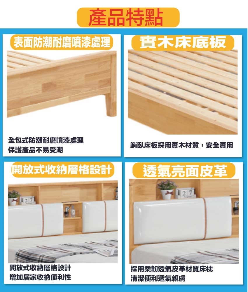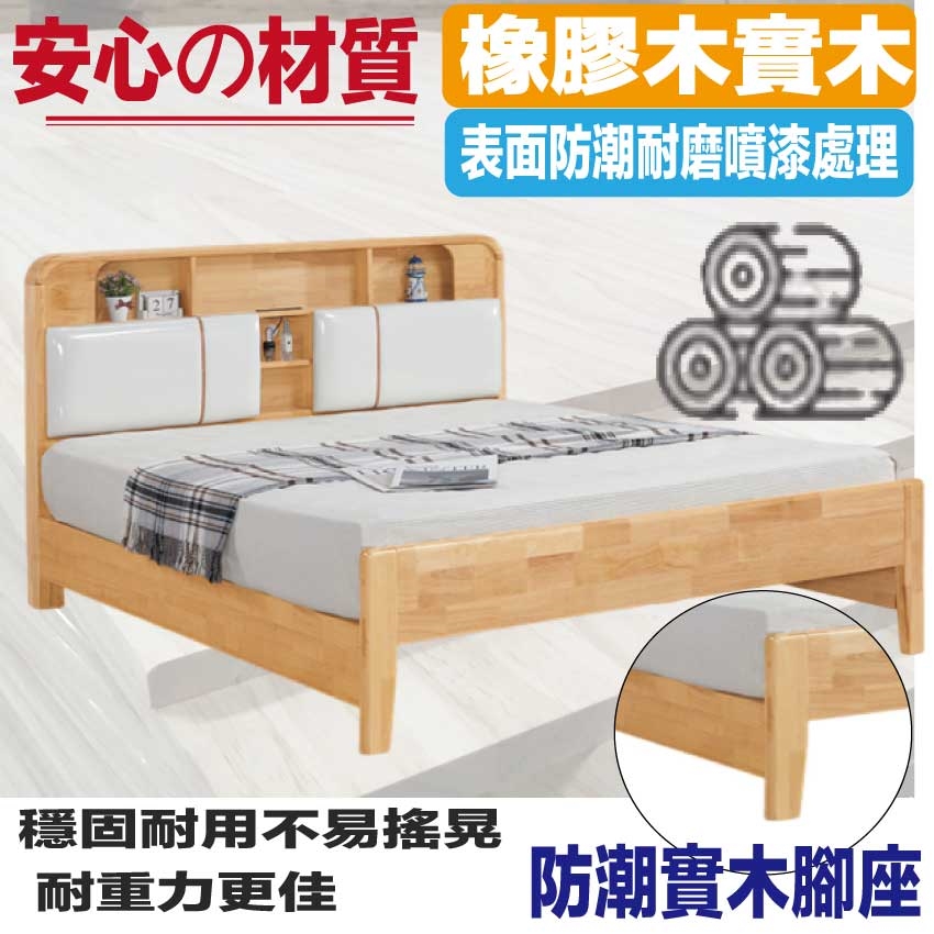 材質:橡膠木實木+實木床底板+實木曲線腳腳座+透氣柔韌皮革+高回彈泡棉
