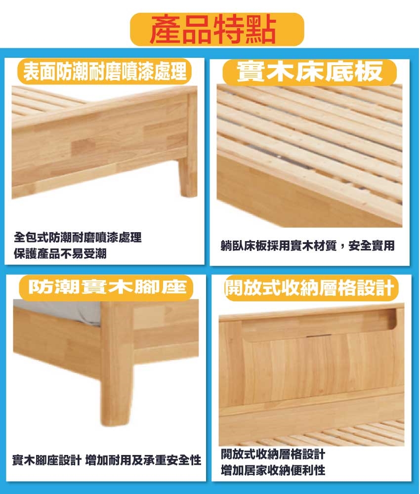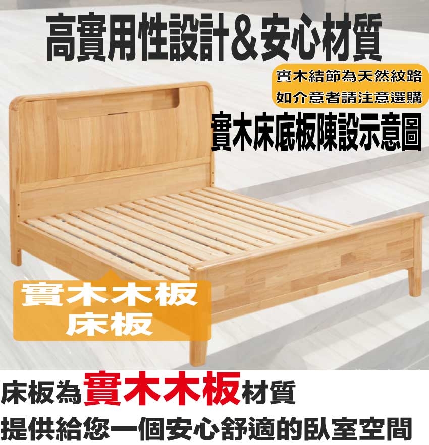 採用橡膠木實木+實木床底板+實木曲線腳腳座等安心材質製造