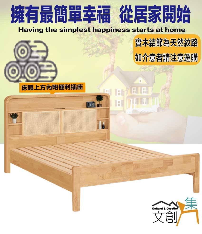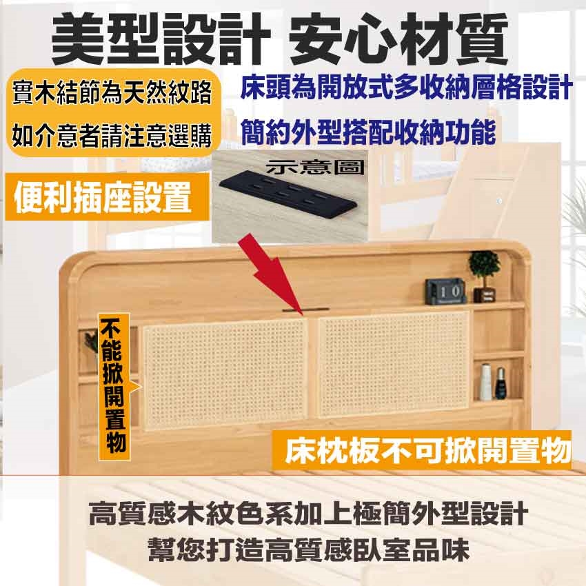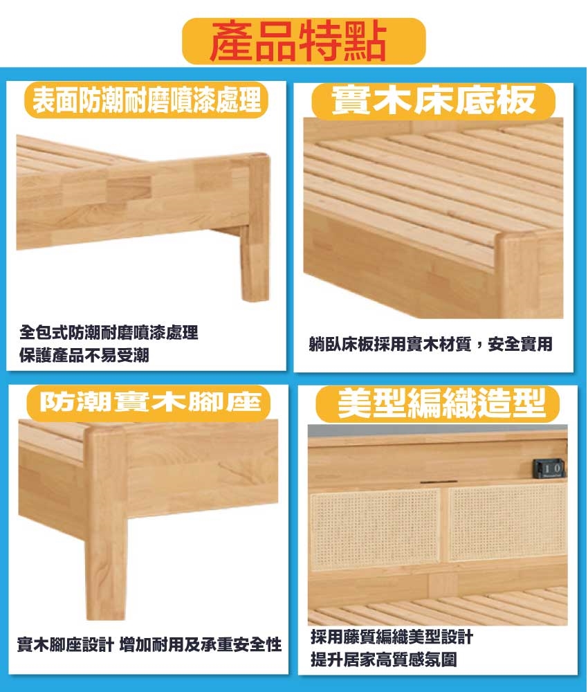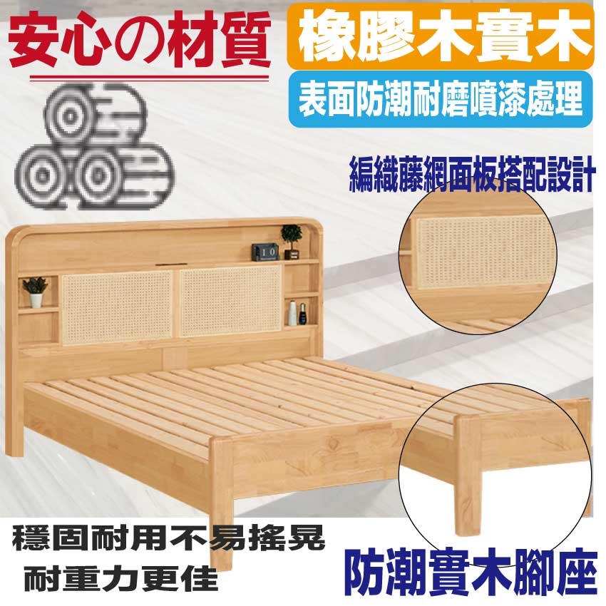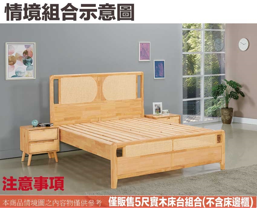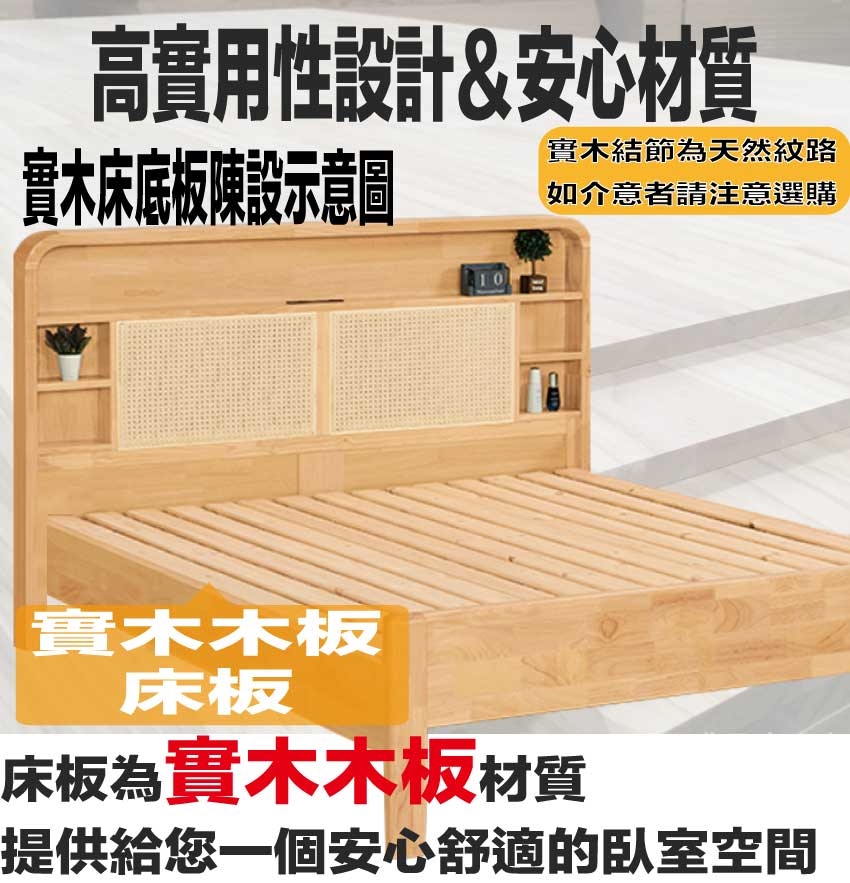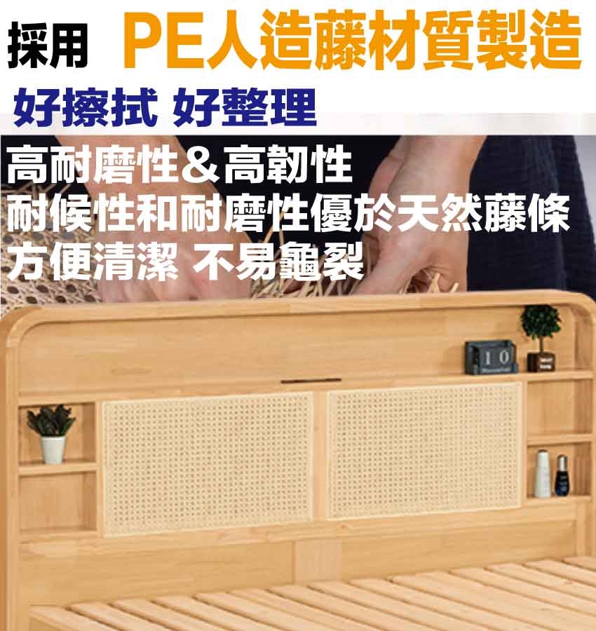 材質:橡膠木實木+實木床底板+實木曲線腳腳座+PE人造藤材質